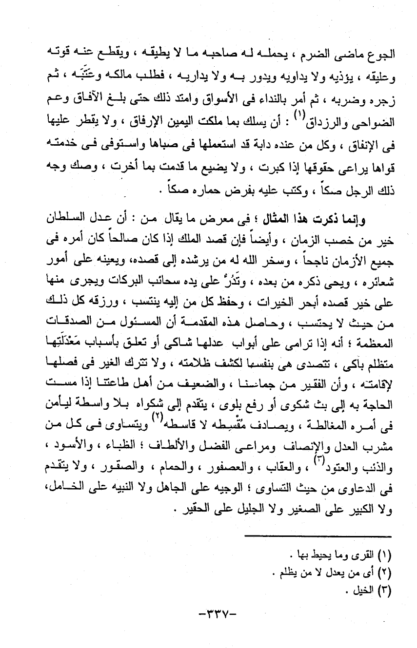 الجوع ماضي الضرم يحمله صاحبه ما لا يطيقه ويقطع عنه قوته وعليقه يؤذيه ولا يداويه ولا يداريه فطلب مالكه وعتبة ثم زخره وضربه ثم أمر بالنداء في الأسواق وامتد ذلك حتى بلغ الآفاق وعم الضواحي والرزداق أن يسلك بما ملكت اليمين الإرفاق ولا يفتر عليها في الأنفاق وكل من عنده دابة قد استعلمها في صباها واستوفى في خدمته قواها يراعي حقوقها إذا كبرت ولا يضيع ما قدمت بما أخرت وصك وجهذلك الرجل صكا وكتب عليه بفرض حماره صكا (وإنما ذكرت) هذا المثال في معرض ما يقال من أن عدل السلطان خير من خصب الزمان وأيضاً فان قصد الملك إذا كان صالحاً كان أمره في جميع الأزمان ناجحاً وسخر الله له من يرشده إلى قصده ويعينه على أمور شعائره ويحيي ذكره من بعده وتدر على يده سحائب البركات ويجري منها على غير قصده أبحر الخيرات وحفظ كل من إليه ينتسب ورزقه كل ذلك من حيث لا يحتسب وحاصل هذه المقدمة أن المسؤل من الصدقات المعظمة انه إذا ترامى على أبواب عدلها شاكي أو تعلق بأسباب معدلتها متظلم باكي تتصدى هي بنفسها لكشف ظلامته ولا تترك الغير في فصلها لإقامته وأن الفقير من جماعتنا والضعيف من أهل طاعتنا إذا مست الحاجة به إلى بث شكوى أو رفع بلوى يتقدم إلى شكواه بلا واسطه ليأمن في أمره المغالطة ويصادف مقسطه لاقاسطه ويتساوى في كل من مشرب العدل والأنصاف ومراعي الفضل والألطاف الظباء والأسود والذئب والعتود والعقاب والعصفور والحمام والصقور ولا يتقدم في الدعاوي من حيث التساوي الوجيه على الجاهل ولا