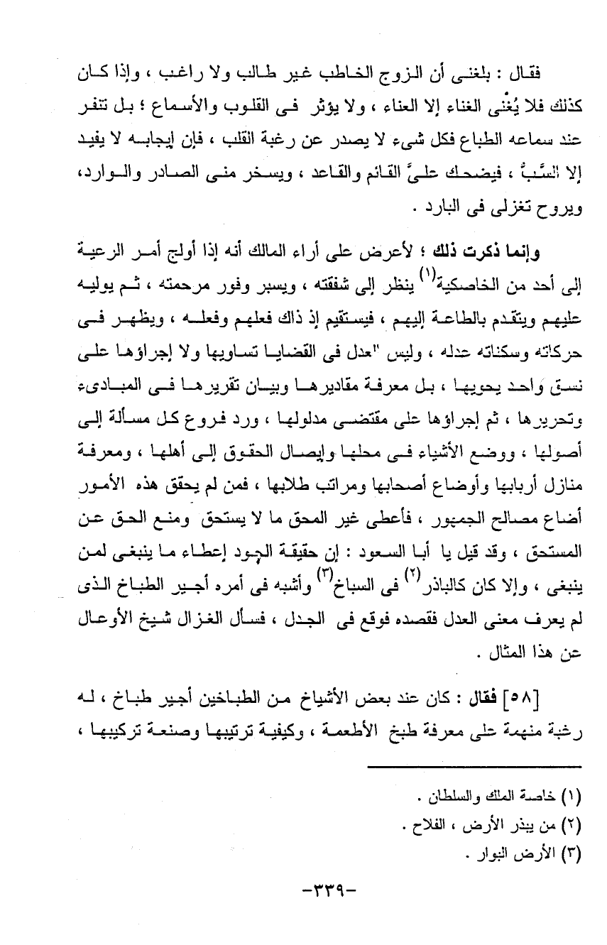 فقال بلغني أن الزوج الخاطب غير طالب ولا راغب وإذا كان كذلك فلا بغني الغناء إلا العناء ولا يؤثر في القلوب والأسماع بل تنغر عند سماعه الطباع فكل شيء لا يصدر عن رغبة القلب فان أيجابه لا يفيد إلا السلب فيضحك على القائم والقاعد ويسخر مني الصادر والوارد ويروح تغزلي في البارد وإنما ذكرت ذلك لأعراض على آراء المالك أنه إذا أولج أمر الرعية إلى أحد من الخاصكية ينظر إلى شفقته ويسير وفور مرحمته ثم يوليه عليهم ويتقدم بالطاعة إليهم فيستقيم إذ ذاك فعلهم وفعله ويظهر في حركاته وسكناته عدله وليس العدل في القضايا تساويها ولا إجراؤها على نسق واحد يحويها بل معرفة مقاديرها وبيان تقريرها في المبادي وتحريرها ثم أجراؤها على مقتضى مدلولها ورد فروع كل مسئلة إلى أصولها ووضع الأشياء في محلها وإيصال الحقوق إلى أهلها ومعرفة منازل أربابها وأوضاع أصحابها ومراتب طلابها فمن لم يحقق هذه الأمور أضاع مصالح الجمهور فأعطى غير المحق ما لا يستحق ومنع الحق عن المستحق وقد قيل يا أبا السعود أن حقيقة الجود إعطاء ما ينبغي لمن ينبغي وإلا كان كالباذر في السباخ وأشبه في أمره أجير الطباخ الذي لم يعرف معنى العدل فقصده فوقع في الجدل فسأل الغزال شيخ الأوعال عن هذا المثال (فقال) كان عند بعض الأشياخ من الطباخين أجير طباخ له رغبة منهمه على معرفة طبخ الأطعمة وكيفية ترتيبها وصنعة تركيبها