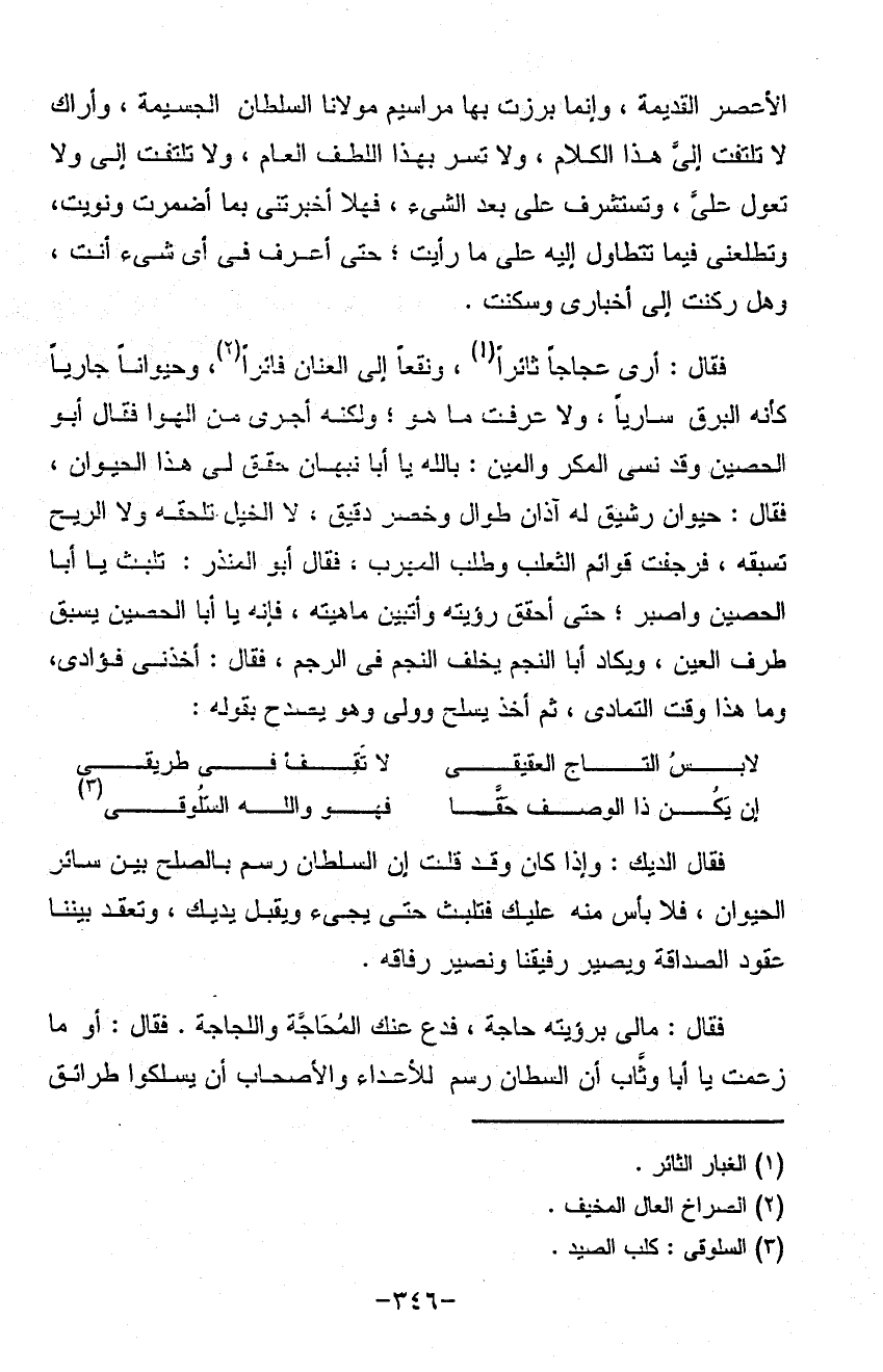 الأعصر القديمة وإنما برزت بها مراسيم مولانا السلطان الجسيمة وأراك لا تلتفت إلى هذا الكلام ولا تسر بهذا اللطف العام ولا تلتفت إلي ولا تغول علي وتستشرف على بعد الشيء فهلا أخبرتني بما أضمرت ونويت وتطلعني فيما تتطاول إليه على ما رأيت حتى أعرف في أي شيء أنت وهل ركنت إلى أخباري وسكنت فقال أرى عجاجاً ثائراً ونقعاً إلى العنان فائراً وحيواناً جارياً كأنه البرق سارياً ولا عرفت ما هو ولكنه أجرى من لهوا فقال أبو الحصين وقد نسي المكر والمين بالله يا أبا نبهان حقق لي هذا الحيوان فقال حيوان رشيق له آذان طوال وخصر دقيق لا الخيل تلحقه ولا الريح تسبقه فرجفت قوائم الثعلب وطلب المهرب فقال أبو المنذر تلبث يا أبا الحصين وأصبر حتى أحقق رؤيته وأتبين ما هيته فانه يا أبا الحصين يسبق طرف العين ويكاد أبا النجم يخلف النجم في الرجم فقال أخذني فؤادي وما هذا وقت التمادي ثم أخذ يسلح وولى وهو يصدح بقوله: