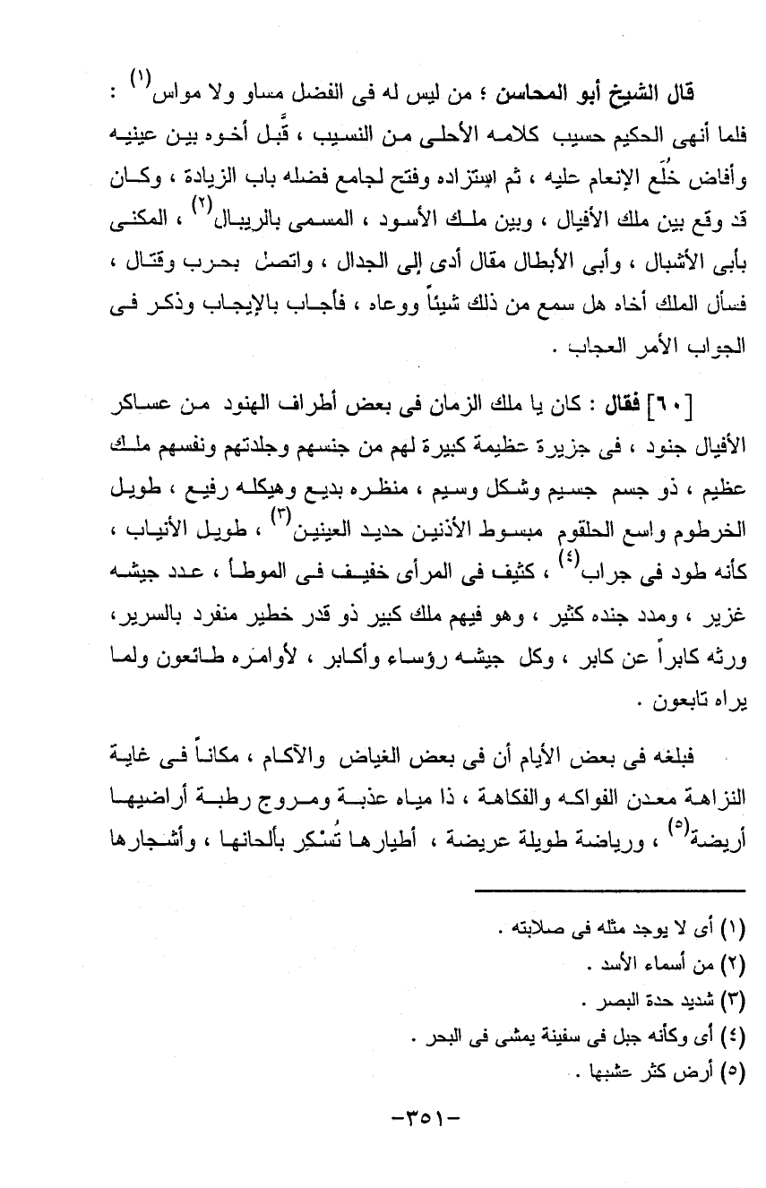 (قال) الشيخ أبو المحاسن من ليس له في الفضل مساو ولا مواس فلما أنهى الحكيم حسيب كلامه لأحلى من النسيب قبل أخوه بين عينيه وأفاض خلع الأنعام عليه استزاده وفتح لجامع فضله باب الزيادة وكان قد وقع بين ملك الأفيال وبين ملك الأسود المسمى بالريبال المكنى بأبي الأشبال وأبي الأبطال مقال أدى إلى جدال وأتصل بحرب وقتال فسأل الملك أخاه هل سمع من ذلك شيأ ووعاه فأجاب بالإيجاب وذكر في الجواب الأمر العجاب (فقال) كان يا ملك الزمان في بعض أطراف الهنود من عساكر الأفيال جنود في جزيرة عظيمة كبيرة من جنسهم وجلدتهم ونفسهم ملك عظيم ذو جسم جسيم وشكل وسيم منظره بديع وهيكله رفيع طويل الخرطوم واسع الحلقوم مبسوط الأذنين حديد العينين طويل الأنياب في جراب كثيف في المرأى خفيف في الموطأ عدد جيشه غزير ومدد جنده كثير وهو فيهم ملك كبير ذو قدر خطير منفرد بالسرير ورثه كابراعى كابر وكل جيشه رؤساء وأكابر لأوامر طائعون ولما يراه تابعون فبلغه في بعض الأيام أن في بعض الغياض والآجام مكاناً في غاية النزاهة معدن الفواكه والفكاهة ذا مياه عذبة ومروج رطبه أراضيها أريضه ورياضه طويلة عريضة أطيارها تسكر بألحانها وأشجارها