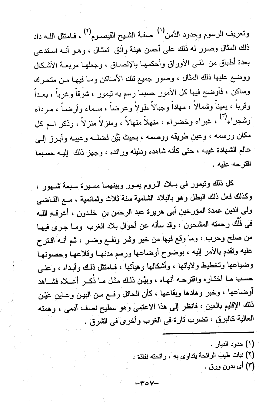 وتعريف الرسوم وحدود ألد من صفة الشيخ القيصوم فامتثل الله داد ذلك المثال وصور له ذلك على أحسن هيئة وآنق تمثال وهو أنه استدعى بعدة أطباق من نقي الأوراق وأحكمها بالإلصاق وجعلها مربعة الأشكال ووضع عليها ذلك المثال وصور جميع تلك الأماكن وما فيها من متحرك وساكن فأوضح فيها كل الأمور حسبما رسم به تيمور شرقاً وغرباً بعداً وقرباً يميناً وشمالاً مهاداً وجبالاً طولاً وعرضاً سماء وأرضاً مرداء وشجراء غبراء وخضراء منهلاً منهلاً ومنزلاً ومنزلاً وذكر أسم كل مكان ورسمه وعين طريقه ووسمه بحيث بين فضله وعيبه وأبرز إلى عالم الشهادة غيبة حتى كأنه شاهده ودليله ورائده وجهز ذلك إليه حسبما اقترحه عليه كل ذلك تيمور في بلاد الروم يمور وبينهما مسيرة سبعة شهور وكذلك فعل ذلك البطل وهو بالبلاد الشامية سنة ثلاث وثمانميه مع القاضي ولي الدين عمدة المؤرخين أبي هريرة عبد الرحمن بن خلدون أغرقه الله في فلك رحمته المشحونوقد سأله عن أحوال بلاد العرب وما جرى فيها من صلح وحرب وما وقع فيها من خير وشر ونفع وضر ثم أنه اقترح عليه وتقدم بالأمر إليه يوضع أوضاعها ورسم مدنها وقلاعها وحصونها وضياعها وتخطيط ولاياتها وأشكالها وهيآنها فامتثل ذلك وأبداه وعلى حسب ما اختاره واقترحه أنهان وبين ذلك مثل ما ذكره أعلاه فشاهد أوضاعها وخبر وهادها وبقاعها كأن الحائل رفع من البين وعاين ذلك الإقليم بالعين فانظر إلى هذا الأعتمي وهو سطيح نصف آدمي وهمته العالية كالبرق تضرب تارة في الغرب وأخرى في الشرق