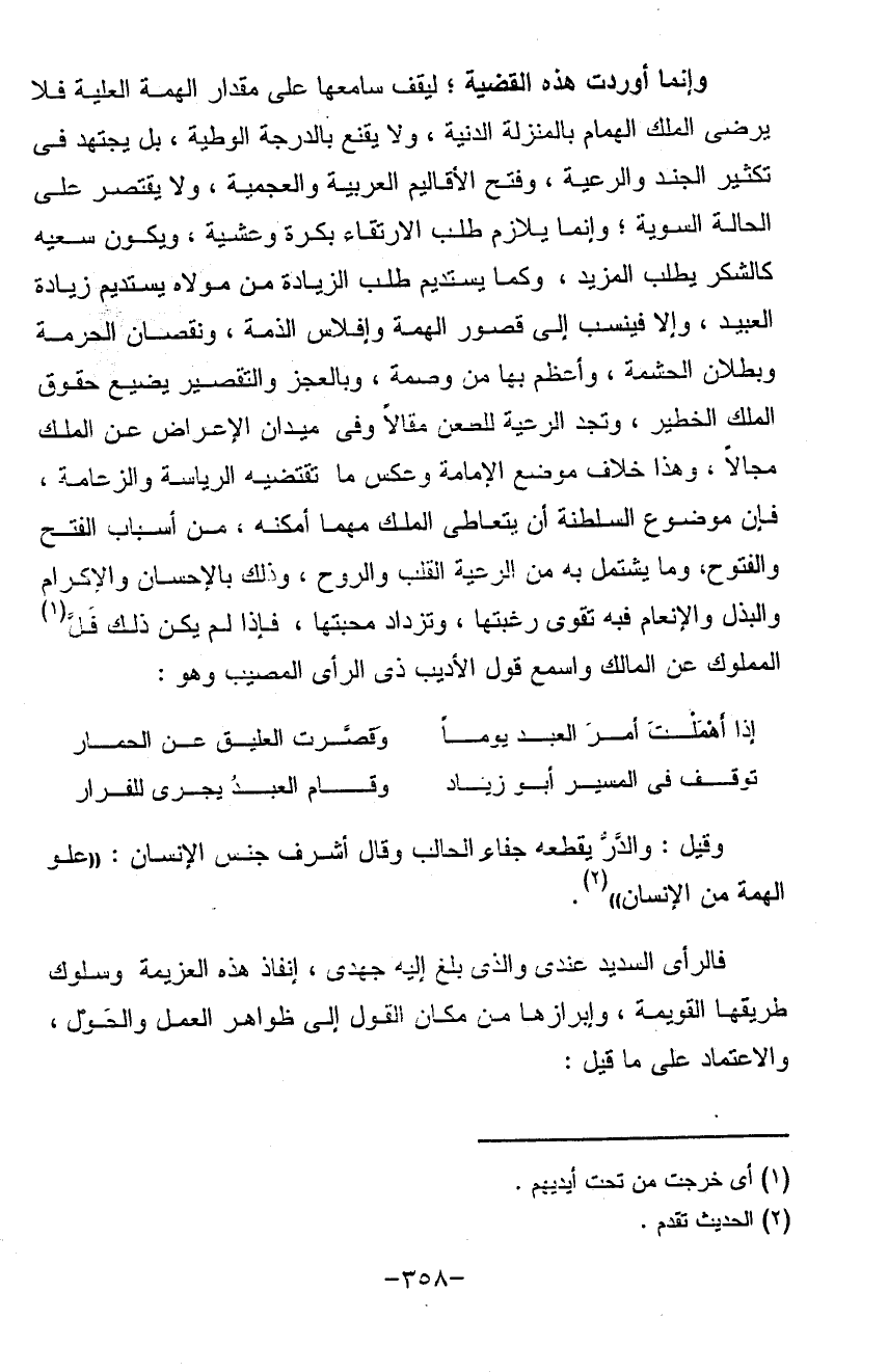 (وإنما أوردت) هذه القضية ليقف سامعها على مقدار الهمة العلية فلا يرضى الملك الهمام بالمنزلة الدينية ولا يقنع بالدرجة الوطية بل يجتهد في تكثير الجند والرعية وفتح الأقاليم العربية والعجمية ولا يقتصر على الحالة السوية وإنما يلازم طلب الارتقاء بكرة وعشية ويكون سعيه كالشكر يطلب المزيد وكما يستديم طلب الزيادة من مولاه يستديم زيادة العبيد والافينسب إلى قصور الهمة وإفلاس الذمة ونقصان الحرمة وبطلان الحشمه وأعظم بها من وصمه وبالعجز والتقصير يضيع حقوق الملك الخطير وتجد الرعية للطعن مقالاً وفي ميدان الأعراض عن الملك مجالاً وهذا خلاف موضع الإمامة وعكس ما تقتضيه