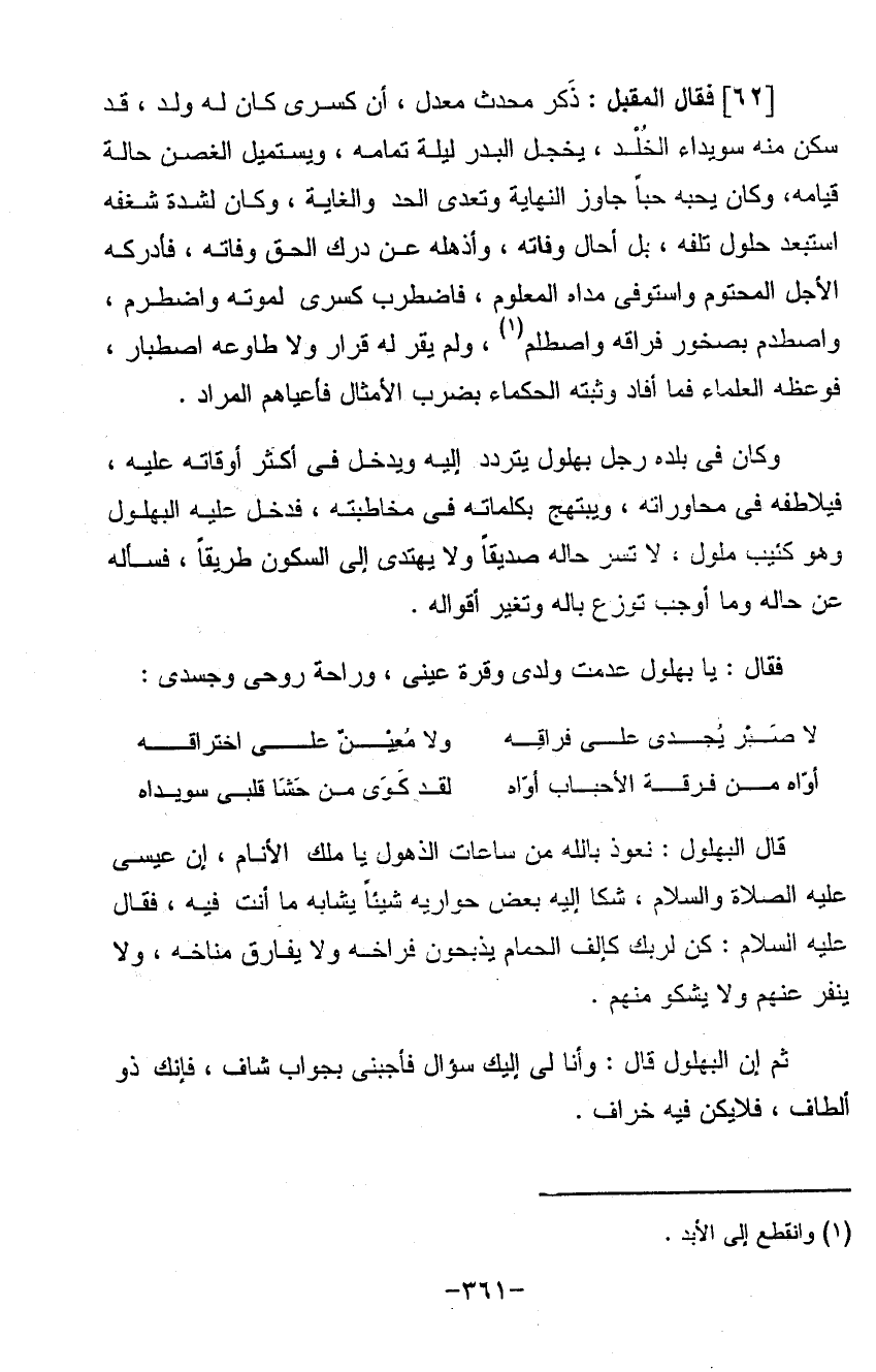 (فقال) المقبل ذكر محدث معدل أن كسرى كان له ولد قد سكن منه سويداء الخلد يخجل البدر ليلة تمامه ويستميل الغصن حاله قيامه وكان يحبه حبا جاوز النهاية وتعدى الحد والغاية وكان لشدة شغفه استبعد حلول تلفه بل أحال وفاته وأذهله عن درك الحق وفاته فأدركه الأجل المحتوم واستوفى مداه المعلوم فاضطرب كسرى لونه واصطدم بصخور فراقه واصطلم ولم يقر له قرار ولا طاعة اصطبار فوعظه العلماء فما أفاد وثبته الحكماء بضرب الأمثال فأعياهم المراد وكان في بلده رجل بهلول يتردد إليه ويدخل في أكثر أوقاته عليه فيلاطفه في محاروته ويبتهج بكلماته في مخاطبته فدخل عليه البهلول وهو كئيب ملول لا تسر حاله صديقاً ولا يهتدي إلى السكون طريقاً فسأله عن حاله وما أوجب توزع باله وتغير أقواله فقال يا بهلول عدمت ولدى وقرة عيني وراحة روحي وجسدي (شعر) :