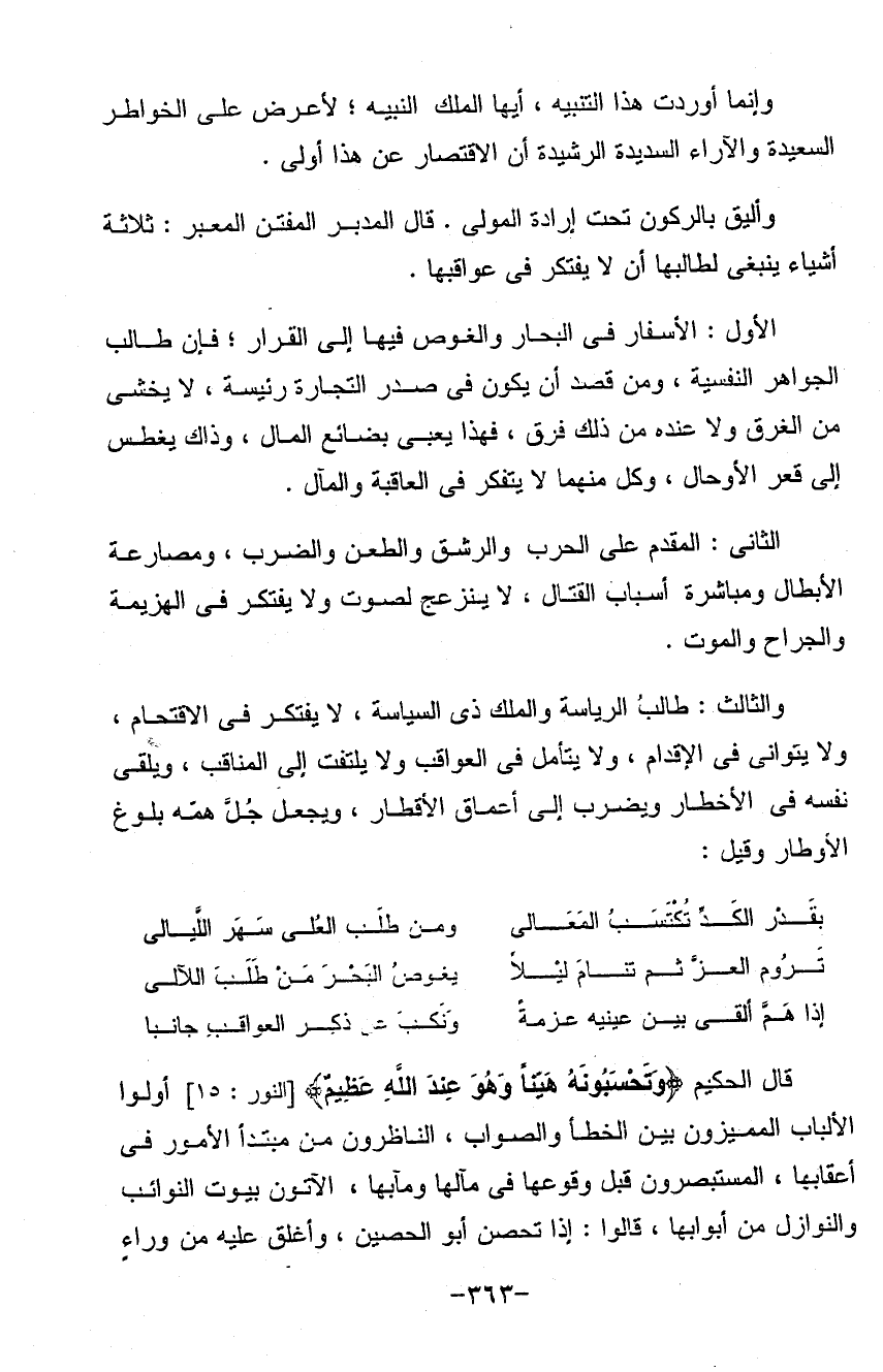 (وإنما أوردت) هذا التنبيه أيها الملك النبيه لا عرض على الخواطر السعيدة والآراء السديدة والآراء الرشيدة أن الأقتصار عن هذا أولى وأليق بالركون تحت إرادة المولى قال المدبر المفنن المعبر ثلاثة أشياء ينبغي لطالبها أن لا يفتكر في عواقبها الأول الأسفار في البحار والغوص فيها إلى القرار فان طالب الجواهر النفيسة ومن قصد أن يكون في صدر التجارة رئيسه لا يخشى من الغرق ولا عنده من ذلك فرق فهذا يعبى بضائع المال وذاك يغطس إلى قعر الأوحال وكل منهما لا يتفكر في العاقبة والمآكل الثاني المقدم على الحرب والرشق والطعن والضرب ومصارعة الأبطال ومباشرة أسباب القتال لا ينزعج لصوت ولا يفتكر في الهزيمة والجراح والموت والثالث طالب الرياسة والملك ذي السياسية لا يفتكر في الاقتحام ولا يتوانى في الأقدام ولا يتأمل في العواقب ولا يلتفت إلى المناقب ويلقي نفسه في الأخطار ويضرب إلى أعماق الأقطار ويجعل جل همه بلوغ الأوطار وقيل: