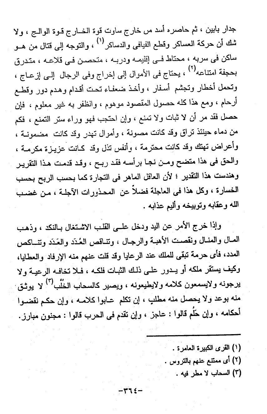 جدار بابين صم حاصره أسد من خارج ساوت قوة الخارج قوة الوالج ولا شك أن حركة العساكر وقطع الفيا في والدساكر والتوجه إلى قتال من هو ساكن في سربه محتاط في إقليمه ودربه متحصن في قلاعه متدرق بحجفة امتناعه يحتاج في الأموال إلى إخراج وفي الرجال إلى إزعاج وتحمل أخطار وتجشم أسفار وأخذ ضعفاء تحت أقدام وهدم دور وقطع أرحام ومع هذا كله حصول المقصود موهوم والظفر به غير معلوم فان حصل فقد مر أن لا ثبات ولا تمنع وأن احتجب فهو وراء ستر التمنع فكم من دماء حينئذ تراق وقد كانت مصونة وأموال تهدر وقد كانت مضمونه وأعراض تهتك وقد كانت محترمة وأنفس تذل وقد كانت عزيزة مكرمه والحق في هذا متضح ومن نجا برأسه فقد ربح وقد قدمت هذا التقرير وهندست هذا التقدير لأن العاقل الماهر في التجارة كما يحسب الربح يحسب الخسارة وكل هذا في العاجلة فصلا عن المحذورات الآجلة من غضب الله وعقابه وتوبيخه وأليم عذابه وإذا خرج الأمر عن اليد ودخل على القلب الاشتغال بالنكد وذهب المال والمنال ونقصت الأهبة والرجال وتناقص العدد والعدد وتناكص المدد والمدد فأي حرمة تبقى للملك عند الرعايا وقد قلت عنهم منه الأرفاد والعطايا وكيف يستقر ملكه أو يدور على فلك الثبات فلكه فلا تخافه الرعية ولا يرجونه ولا يسمعون كلامه ولا يطيعونه ويصير كالسحاب الخلب لا يوثق منه بوعد ولا يحصل منه مطلب أن تكلم عابوا كلامه وأن حكم نقضوا أحكامه وأن حلم قالوا عاجز وإن تقدم في الحرب قالوا مجنون مبارز