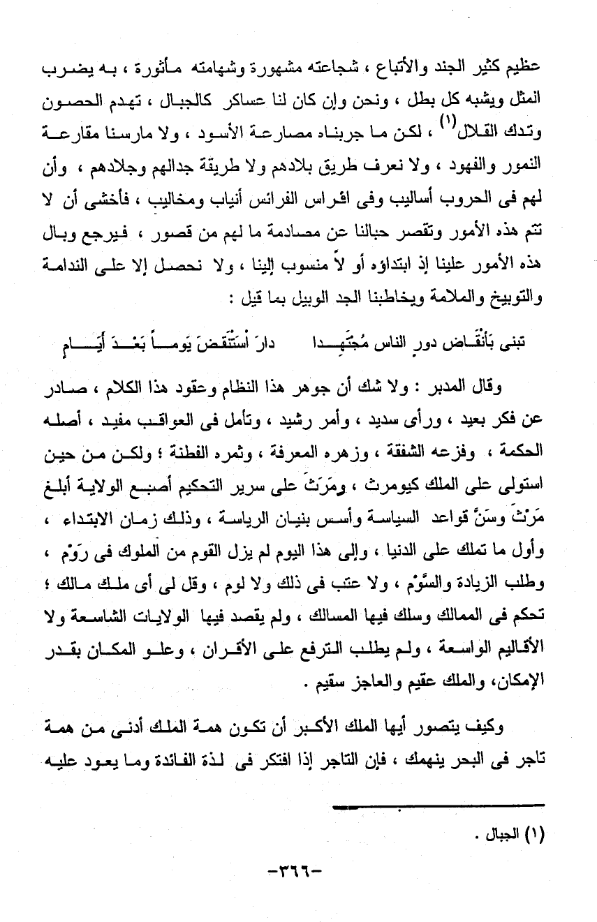 عظيم كثير الجند والأتباع شجاعته مشهورة وشهامته مأثورة به يضرب المثل ويشيه كل بطل ونحن وإن كان لنا عساكر كالجبال تهدم الحصون وتدك القلال لكن ما جر بنا مصارعة الأسود ولا مارسنا مقارعة النمور والفهود ولا نعرف طريق بلادهم ولا طريقة جدالهم وجلادهم وأن لهم في الحروب أساليب وفي افتراس الفرائس أنياب ومخاليب أن لا تتم هذه الأمور وتقصر حبالنا عن مصادمة مالهم من قصور فيرجع وبال هذه الأمور علينا إذ ابتداؤه أو لا منسوب الينا ولا تحصل إلا على الندامة والتوبيخ والملامة ويخطبنا الجد الوبيل بما قيل: