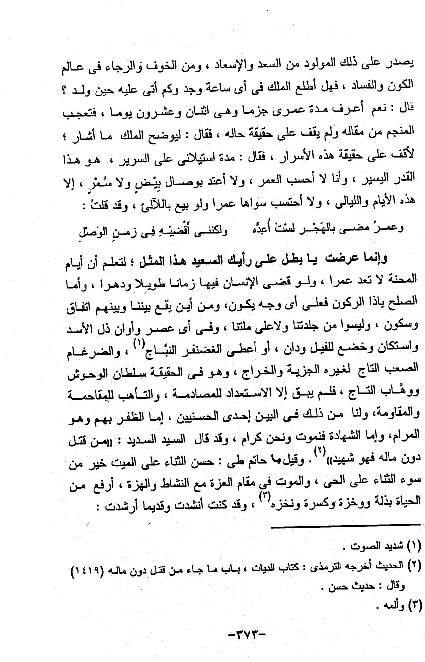 وإنما عرضت يا بطل على رأيك السعيد هذا المثل لتعلم أن أيام المحنة لا تعد عمرا ولو قضى الإنسان فيها زمانا طويلا ودهرا وأما الصلح يا ذا الركون فعلى أي وجه يكون ومن أين يقع بيننا وبينهم اتفاق وسكون وليسوا من جلدتنا ولا على ملتنا وفي عصر وأوان ذل الأسد واستكان وخضع للفيل ودان أو أعطى الغضنفر النباج والضرغام الصعب الناج لغيره الجزية والخراج وهو في الحقيقة سلطان الوحوش ووهاب التاج فلم يبق إلا الاستعداد للمصادمة والتأهب للمقاحمة والمقاومة ولنا من ذلك في البين إحدى الحسنين أما الظفر بهم وهو المرام وأما الشهادة فنموت ونحن كرام وقد قال السيد السديد من قتل دون ماله فهو شهيد وقيل يا حاتم طي: حسن الثناء على الميت خير من سوء الثناء على الحي والموت في مقام العزة مع النشاط والهزة أرفع من الحياة بذلة ووخزة وكسرة ونخزة وقد كنت أنشدت وقديما أرشدت: