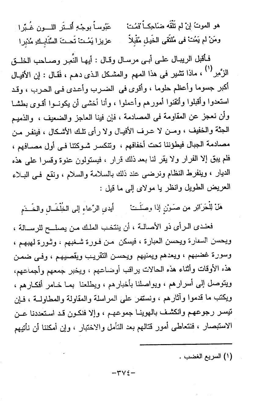 فعندي الرأي ذو الأصالة أن ينتخب الملك من يصلح للرسالة ويحسن السفارة ويحسن العبارة فيسكن من فوره شغبهم وثورة لهبهم وسورة غضبهم ويعدهم ويمنيهم ويحسن التقريب ويقصيهم وفي ضمن هذه الأوقات وأثناء هذه الحالات يراقب أوضاعهم ويخبر جمعهم وأجماعهم ويتوصل إلى أسرارهم ويواصلنا بأخبارهم ويطالعنا بمخامر أفكارهم ويكتب ما قدموا وآثارهم ونستمر على المراسلة والمقاومة والمطاولة فإن تيسر رجوعهم وانكشف بالهوينا جموعهم وإلا فنكون قد استعددنا عن الاستبصار فنتعاطى أمور قتالهم بعد التأمل والاختبار وإن أمكننا أن نأتيهم