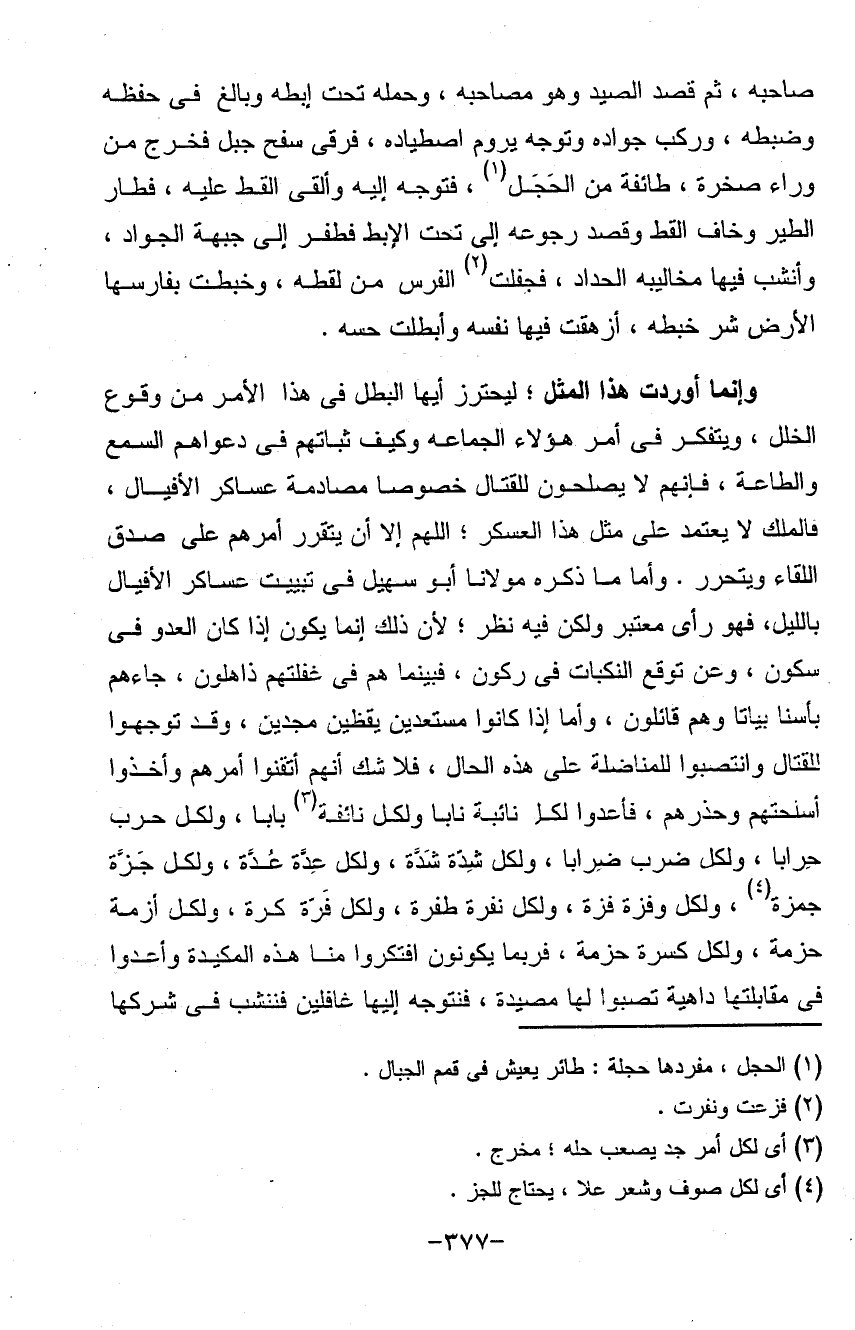 صاحبه ثم قصد الصيد وهو مصاحبه وحمله تحت إبطه وبالغ في حفظه وضبطه وركب جواده وتوجه يروم اصطياده فرقى سفح جبل فخرج من وراء صخرة طائفة من الحجل فتوجه إليه وألقى القط عليه فطار الطير وخاف القط وقصد رجوعه إلى تحت الإبط فطفر إلى جبهة الجواد وأنشب فيها مخاليبه الحداد فجفلت الفرس من القطة وخبطت بفارسها الأرض شر خبطة أزهقت فيها نفسه وأبطلت حسه (وإنما أوردت) هذا المثل ليحترز أيها البطل في هذا الأمر من وقوع الخلل ويتفكر في أمر هؤلاء الجماعة وكيف ثباتهم في دعواهم السمع والطاعة فإنهم لا يصلحون للقتال خصوصا مصادمة عساكر الأفيال فالملك لا يعتمد على مثل هذا العسكر اللهم أن يتقرر أمرهم على صدق اللقاء ويتحرر وأما ذكره مولانا أبو سهيل في تبييت عساكر الأفيال بالليل فهو رأي معتبر ولكن فيه نظر لأن ذلك إنما يكون إذا كان العدو