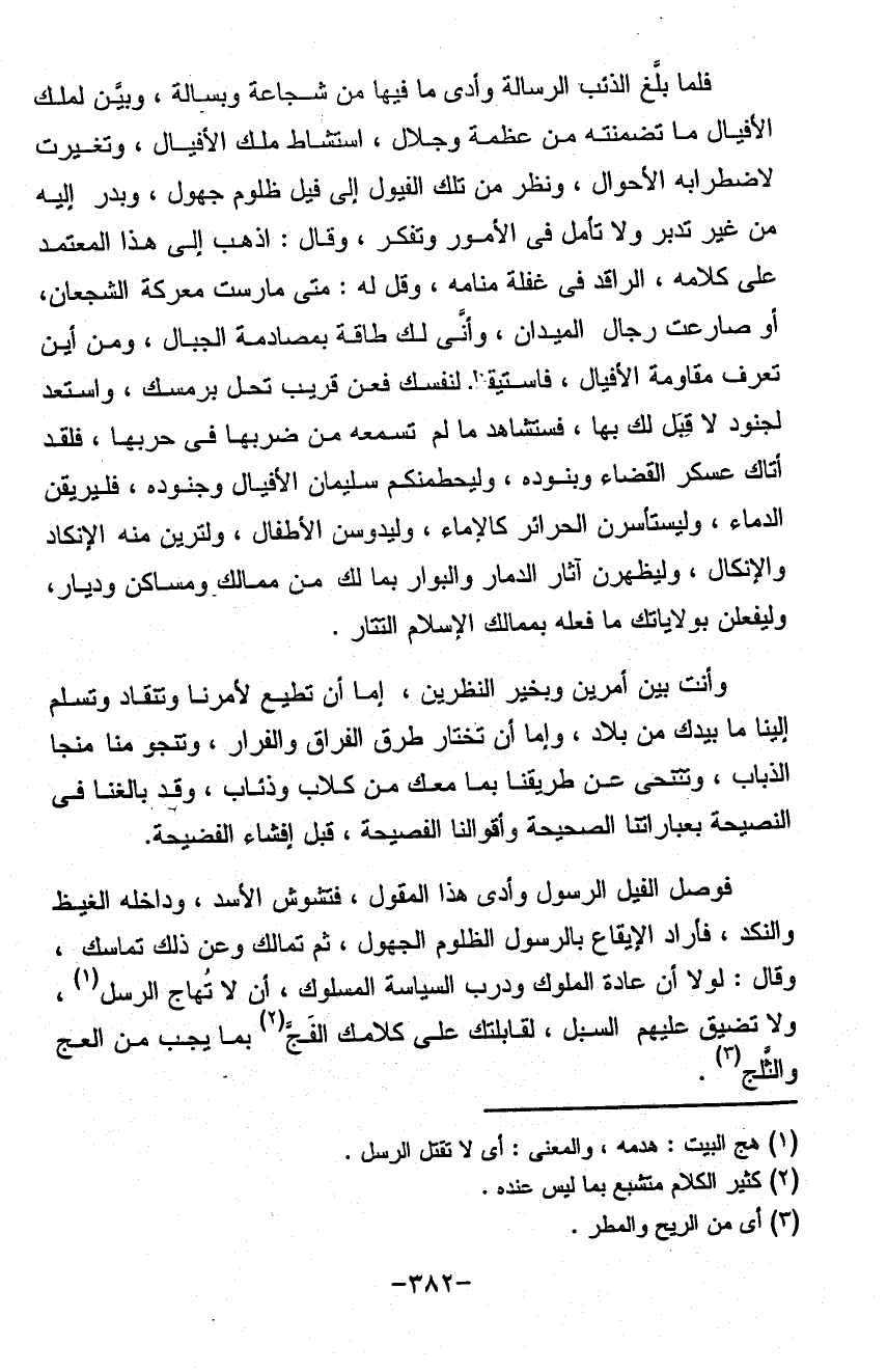 فلما بلغ الذئب الرسالة وأدى ما فيها من شجاعة وبسالة وبين لملك الأفيال ما تضمنته من عظمة وجلال استشاط ملك الأفيال وتغيرت لاضطرابه الأحوال ونظر من تلك الفيول إلى فيل ظلوم جهول وبدر إليه من غير تدبر ولا تأمل في الأمور وتفكر وقال اذهب إلى هذا العتمد على كلامه الراقد في غفلة منامه وفل له متى مارست معركة الشجعان أو صارعت رجال الميدان وأنى لك طاقة بمصادمة الجبال ومن أين تعرف مقامة الأفيال فاستيقظ لنفسك فعن قريب تحل برمسبك واستعد لجنود لا قبل لك بها فستشاهد ما لم تسمعه من ضربها في حربها فلقد أتاك عسكر القضاء وبنوده وليحظمنكم سليمان الأفيال وجنوده فلير يقن ولسيتأسرن الحرائر كالإماء وليدوسن الأطفال ولترين منه الإنكاد والأنكال وليظهرن آثار الدمار والبوار بمالك من ممالك ومساكن وديار وليفعلن بولاياتك ما فعله بممالك الإسلام التتار وأنت بين أمرين وبخير النظرين إما أن تطيع لأمرنا وتنقاه وتسلم إلينا ما بيدك من بلاد وأما أن تختار طرق الفراق والفرار وتنجو منا منجا الذباب وتتنحى عن طريقنا بما معك من كلاب وذئاب وقد بالغنا في النصيحة بعبارات الصحيحة وأقوالنا الفصيحة قبل إفشاء الفضيحة فوصل الفيل الرسول وأدى هذا القول فتشوش الأسد وداخله الغيظ والنكد فأراد الإيقاع بالرسول الظلوم الجهول ثم تمالك وعن ذلك تمامك وقال لولا أن عادة الملوك ودرب السياسة المسلوك أن لا تهاج الرسل ولا