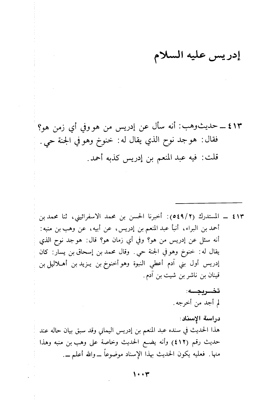 413 - المستدرك (2/ 549): أخبرنا الحسن بن محمد الاسفرائيني، ثنا محمد بن أحمد بن البراء، أنبأ عبد المنعم بن إدريس، عن أبيه، عن وهب بن منبه: أنه سئل عن إدريس من هو؟ وفي أي زمان هو؟ قال: هو جد نوح الذي يقال له: خنوخ وهو في الجنة حي. وقال محمد بن إسحاق بن يسار: كان إدريس أول بني آدم أعطي النبوة وهو أخنوخ بن يزيد بن أهلاليل بن قينان بن ناشر بن شيت بن آدم.