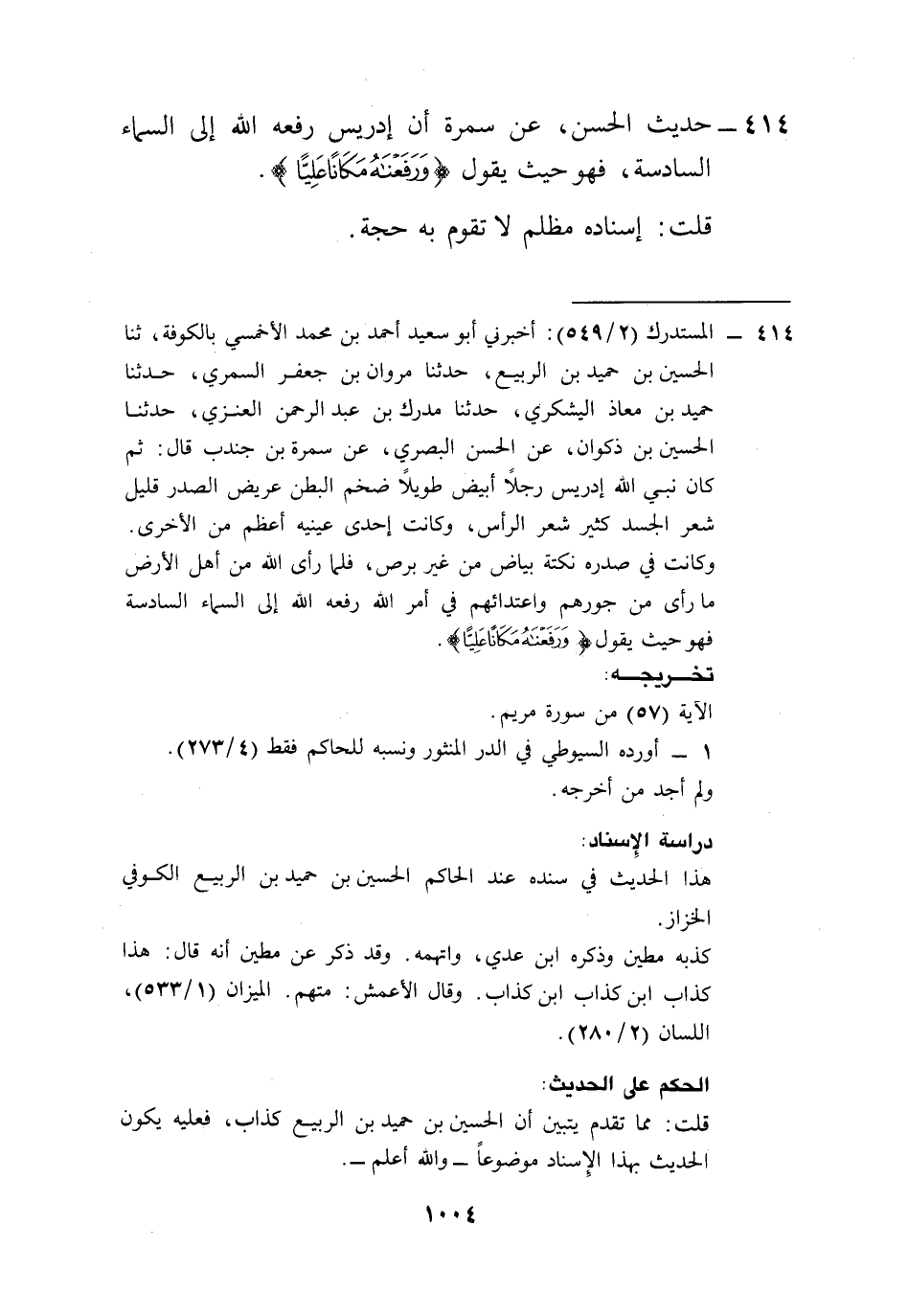 414 - حديث الحسن، عن سمرة أن إدريس رفعه الله إلى السماء السادسة، فهو حيث يقول {وَرَفَعْنَاهُ مَكَانًا عَلِيًّا (57)} [مريم: 57].