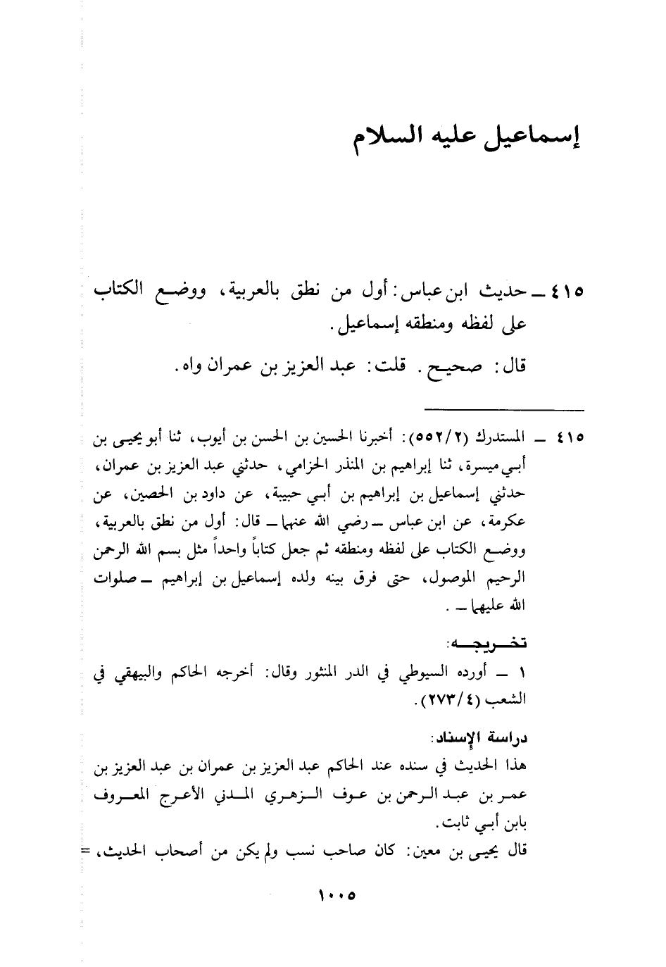 415 - المستدرك (2/ 552): أخبرنا الحسين بن الحسن بن أيوب، ثنا أبو يحيى بن أبي ميسرة، ثنا إبراهيم بن المنذر الحزامي، حدثني عبد العزيز بن عمران، حدثني إسماعيل بن إبراهيم بن أبي حبيبة، عن داود بن الحصين، عن عكرمة، عن ابن عباس -رضي الله عنهما- قال: أول من نطق بالعربية، ووضع الكتاب على لفظه ومنطقه ثم جعل كتاباً واحداً مثل بسم الله الرحمن الرحيم الموصول، حتى فرق بينه ولده إسماعيل بن إبراهيم -صلوات الله عليهما-.