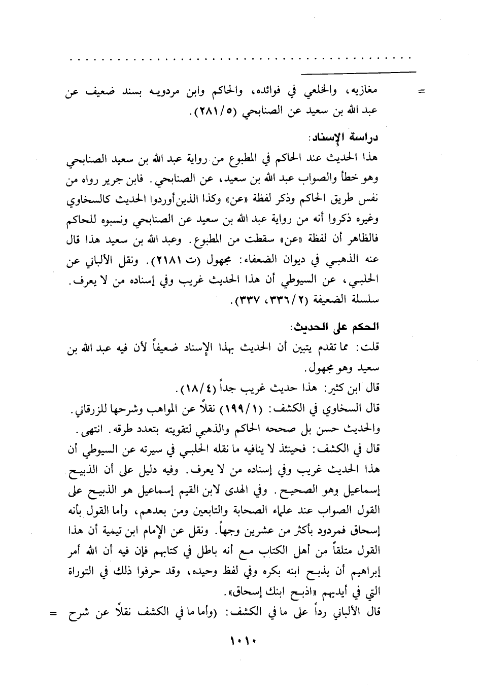 قال في الكشف: فحينئذ لا ينافيه ما نقله الحلبي في سيرته عن السيوطي أن هذا الحديث غريب وفي إسناده من لا يعرف. وفيه دليل على أن الذبيح إسماعيل وهو الصحيح. وفي الهدى لابن القيم إسماعيل هو الذبيح على القول الصواب عند علماء الصحابة والتابعين ومن بعدهم، وأما القول بأنه إسحاق فمردود بأكثر من عشرين وجهاً. ونقل عن الإِمام ابن تيمية أن هذا القول متلقاً من أهل الكتاب مع أنه باطل في كتابهم فإن فيه أن الله أمر إبراهيم أن يذبح ابنه بكره وفي لفظ وحيده، وقد حرفوا ذلك في التوراة التي في أيديهم "اذبح ابنك إسحاق".