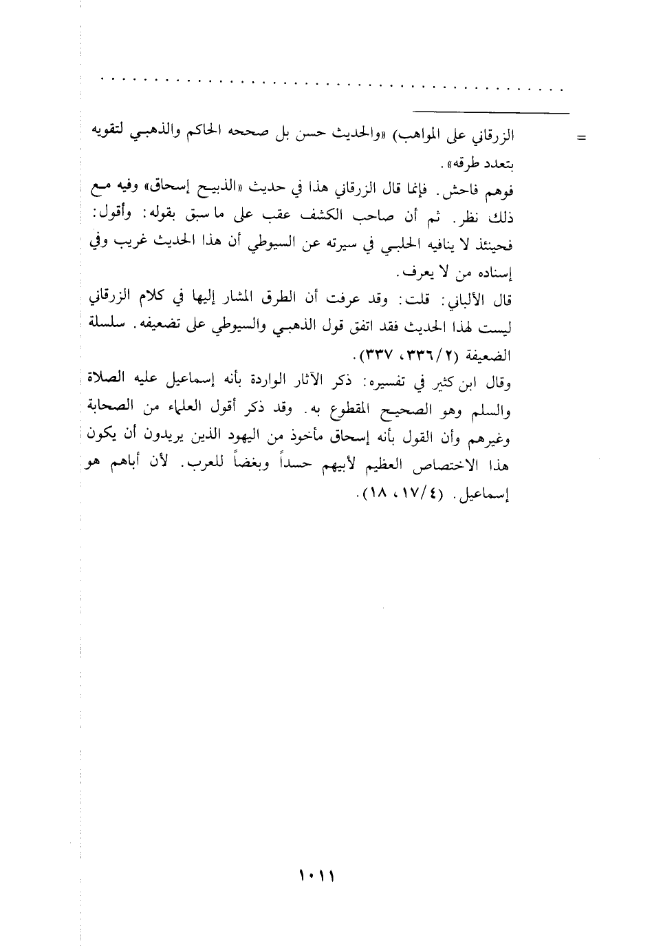 فوهم فاحش. فإنما قال الزرقاني هذا في حديث "الذبيح إسحاق" وفيه مع ذلك نظر. ثم أن صاحب الكشف عقب على ماسبق بقوله: وأقول: فحينئذ لا ينافيه الحلبي في سيرته عن السيوطي أن هذا الحديث غريب وفي إسناده من لا يعرف.