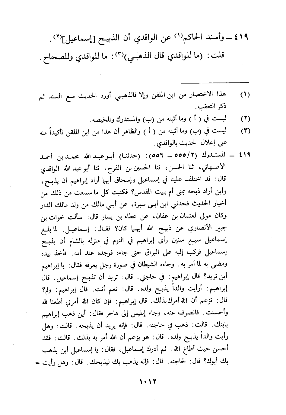 419 - المستدرك (2/ 555 - 556): (حدثنا) أبو عبد الله محمد بن أحمد الأصبهاني، ثنا الحسن، ثنا الحسين بن الفرج، ثنا أبو عبد الله الواقدي قال: قد اختلف علينا في إسماعيل وإسحاق أيهما أراد إبراهيم أن يذبح، وأين أراد ذبحه بمنى أم ببيت المقدس؟ فكتبت على ما سمعت من ذلك من أخبار الحديث فحدثني ابن أبي سبرة، عن أبي مالك من ولد مالك الدار وكان مولى لعثمان بن عفان، عن عطاء بن يسار قال: سألت خوات بن جبير الأنصاري عن ذبيح الله أيهما كان؟ فقال: إسماعيل. لما بلغ إسماعيل سبع سنين رأى إبراهيم في النوم في منزله بالشام أن يذبح إسماعيل فركب إليه على البراق حتى جاءه فوجده عند أمه. فأخذ بيده ومضى به لما أمر به. وجاءه الشيطان في صورة رجل يعرفه فقال: يا إبراهيم أين تريد؟ قال إبراهيم: في حاجتي. قال: تريد أن تذبح إسماعيل. قال إبراهيم: أرأيت والداً يذبح ولده. قال: نعم أنت. قال إبراهيم: ولم؟ قال: تزعم أن الله أمرك بذلك. قال إبراهيم: فإن كان الله أمرني أطعنا لله وأحسنت. فانصرف عنه، وجاء إبليس إلى هاجر فقال: أين ذهب إبراهيم بابنك. قالت: ذهب في حاجته. قال: فإنه يريد أن يذبحه. قالت: وهل رأيت والداً يذبح ولده. قال: هو يزعم أن الله أمر به بذلك. قالت: فقد أحسن حيث أطاع الله. ثم أدرك إسماعيل، فقال: يا إسماعيل أين يذهب بك أبوك؟ قال: لحاجته. قال: فإنه يذهب بك ليذبحك. قال: وهل رأيت =