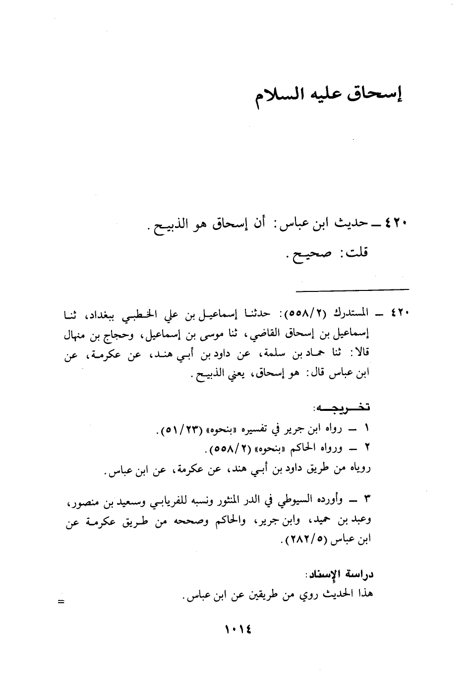 420 - المستدرك (2/ 558): حدثنا إسماعيل بن علي الخطبي ببغداد، ثنا إسماعيل بن إسحاق القاضي، ثنا موسى بن إسماعيل، وحجاج بن منهال قالا: ثنا حماد بن سلمة، عن داود بن أبي هند، عن عكرمة، عن ابن عباس قال: هو إسحاق، يعني الذبيح.