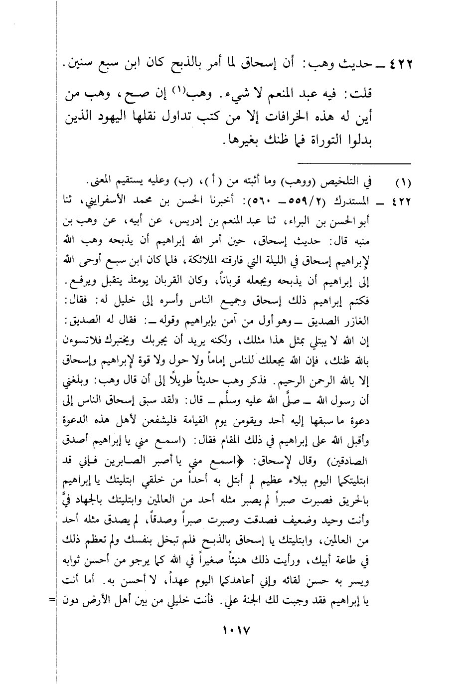 422 - المستدرك (2/ 559 - 560): أخبرنا الحسن بن محمد الأسفرايني، ثنا أبو الحسن بن البراء، ثنا عبد المنعم بن إدريس، عن أبيه، عن وهب بن منبه قال: حديث إسحاق، حين أمر الله إبراهيم أن يذبحه وهب الله لإِبراهيم إسحاق في الليلة التي فارقته الملائكة، فلما كان ابن سبع أوحى الله إلى إبراهيم أن يذبحه ويجعله قرباناً، وكان القربان يومئذ يتقبل ويرفع.