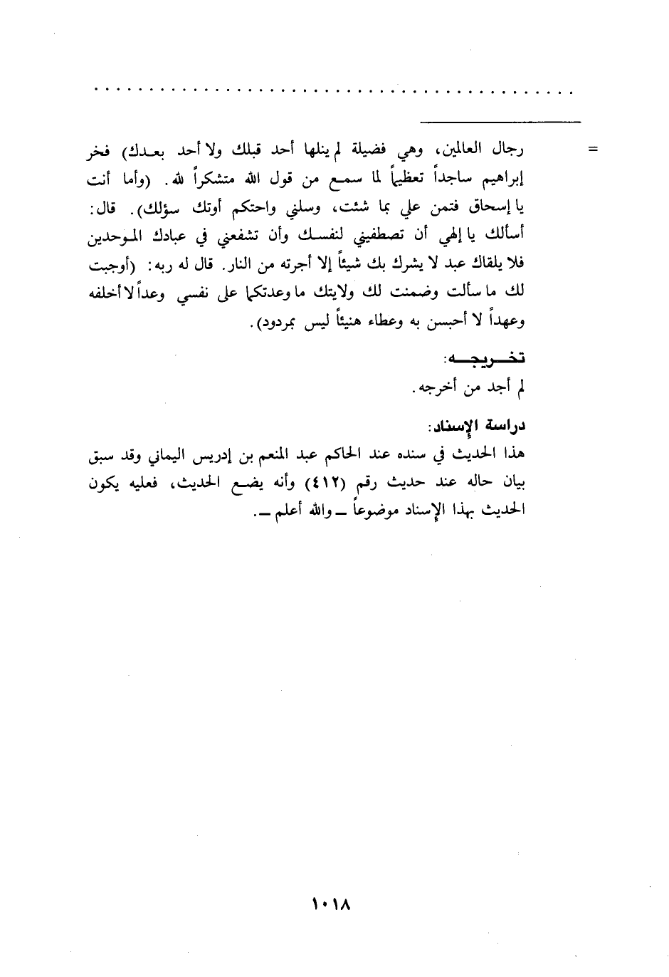 = رجال العالمين، وهي فضيلة لم ينلها أحد قبلك ولا أحد بعدك) فخر إبراهيم ساجداً تعظيماً لما سمع من قول الله متشكراً لله. (وأما أنت يا إسحاق فتمن علي بما شئت، وسلني واحتكم أوتك سؤلك). قال: أسألك يا إلهي أن تصطفيني لنفسك وأن تشفعني في عبادك الموحدين فلا يلقاك عبد لا يشرك بك شيئاً إلا أجرته من النار. قال له ربه: (أوجبت لك ما سألت وضمنت لك ولايتك ما وعدتكما على نفسي وعداً لا أخلفه وعهداً لا أحبسن به وعطاء هنيئاً ليس بمردود).