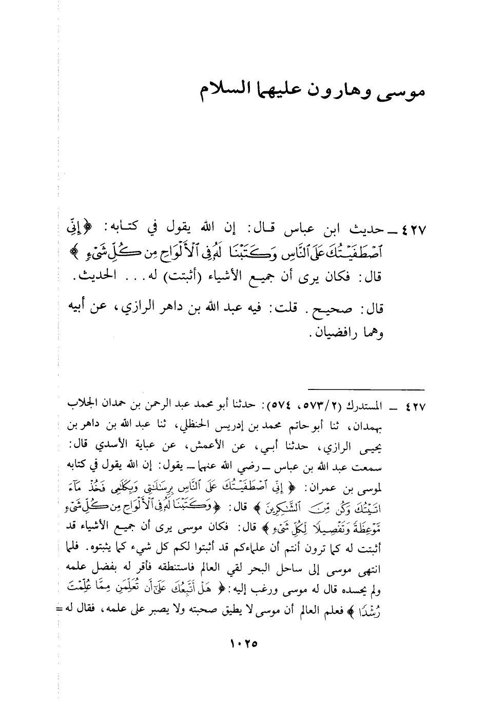 427 - المستدرك (2/ 573، 574): حدثنا أبو محمد عبد الرحمن بن حمدان الجلاب بهمدان، ثنا أبو حاتم محمد بن إدريس الحنظلي، ثنا عبد الله بن داهر بن يحيى الرازي، حدثنا أبي، عن الأعمش، عن عباية الأسدي قال: سمعت عبد الله بن عباس -رضي الله عنهما- يقول: إن الله يقول في كتابه لموسى بن عمران: {إِنِّي اصْطَفَيْتُكَ عَلَى النَّاسِ بِرِسَالَاتِي وَبِكَلَامِي فَخُذْ مَا آتَيْتُكَ وَكُنْ مِنَ الشَّاكِرِينَ (144)} قال: وَكَتَبْنَا لَهُ فِي الْأَلْوَاحِ مِنْ كُلِّ شَيْءٍ مَوْعِظَةً وَتَفْصِيلًا لِكُلِّ شَيْءٍ مَّوعِظةً} قال: فكان موسى يرى أن جميع الأشياء قد أثبتت له كما ترون أنتم أن علماءكم قد أثبتوا لكم على شيء كما يثبتوه. فلما انتهى موسى إلى ساحل البحر لقي العالم فاستنطقه فأقر له بفضل علمه ولم يحسده قال له موسى ورغب إليه: {قَالَ لَهُ مُوسَى هَلْ أَتَّبِعُكَ عَلَى أَنْ تُعَلِّمَنِ مِمَّا عُلِّمْتَ رُشْدًا (66)} [الكهف: 66] فعلم العالم أن موسى لا يطيق صحبته ولا يصبر على علمه، فقال له =