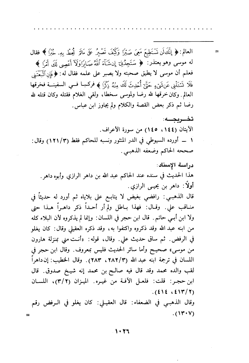 = العالم: {إِنَّكَ لَنْ تَسْتَطِيعَ مَعِيَ صَبْرًا (67) وَكَيْفَ تَصْبِرُ عَلَى مَا لَمْ تُحِطْ بِهِ خُبْرًا (68)} [الكهف:67،68] فقال له موسى وهو يعتذر: {سَتَجِدُنِي إِنْ شَاءَ اللَّهُ صَابِرًا وَلَا أَعْصِي لَكَ أَمْرًا (69)} [الكهف: 69] فعلم أن موسى لا يطيق صحبته ولا يصبر على علمه فقال له: {قَالَ فَإِنِ اتَّبَعْتَنِي فَلَا تَسْأَلْنِي عَنْ شَيْءٍ حَتَّى أُحْدِثَ لَكَ مِنْهُ ذِكْرًا (70)} [الكهف: 70] فركبا في السفينة فخرقها العالم. وكان خرقها لله رضا ولموسى سخطا، ولقي الغلام فقتله وكان قتله لله رضا ثم ذكر بعض القصة والكلام ولم يجاوز ابن عباس.