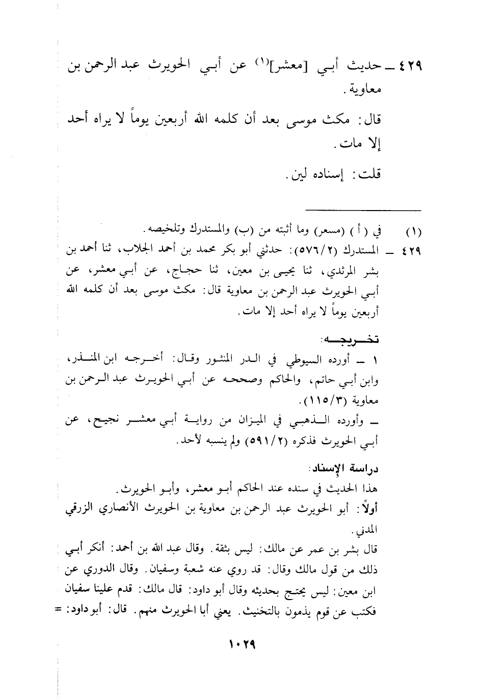 429 - المستدرك (2/ 576): حدثني أبو بكر محمد بن أحمد الجلاب، ثنا أحمد بن بشر المرثدي، ثنا يحيى بن معين، ثنا حجاج، عن أبي معشر، عن أبي الحويرث عبد الرحمن بن معاوية قال: مكث موسى بعد أن كلمه الله أربعين يوماً لا يراه أحد إلا مات.