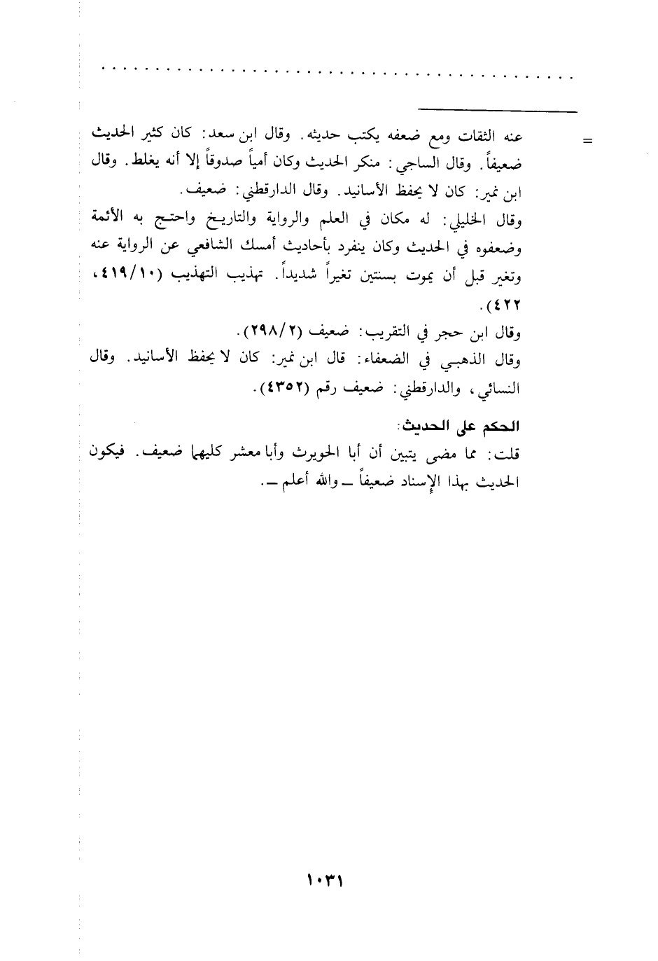 قلت: مما مضى يتبين أن أبا الحويرث وأبا معشر كليهما ضعيف. فيكون الحديث بهذا الإِسناد ضعيفاً -والله أعلم-.