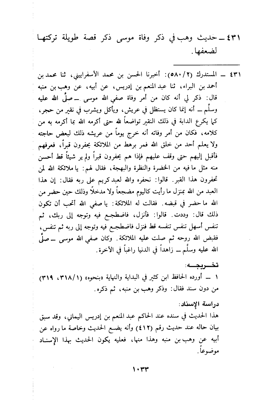 431 - حديث وهب في ذكر وفاة موسى ذكر قصة طويلة تركتها لضعفها.