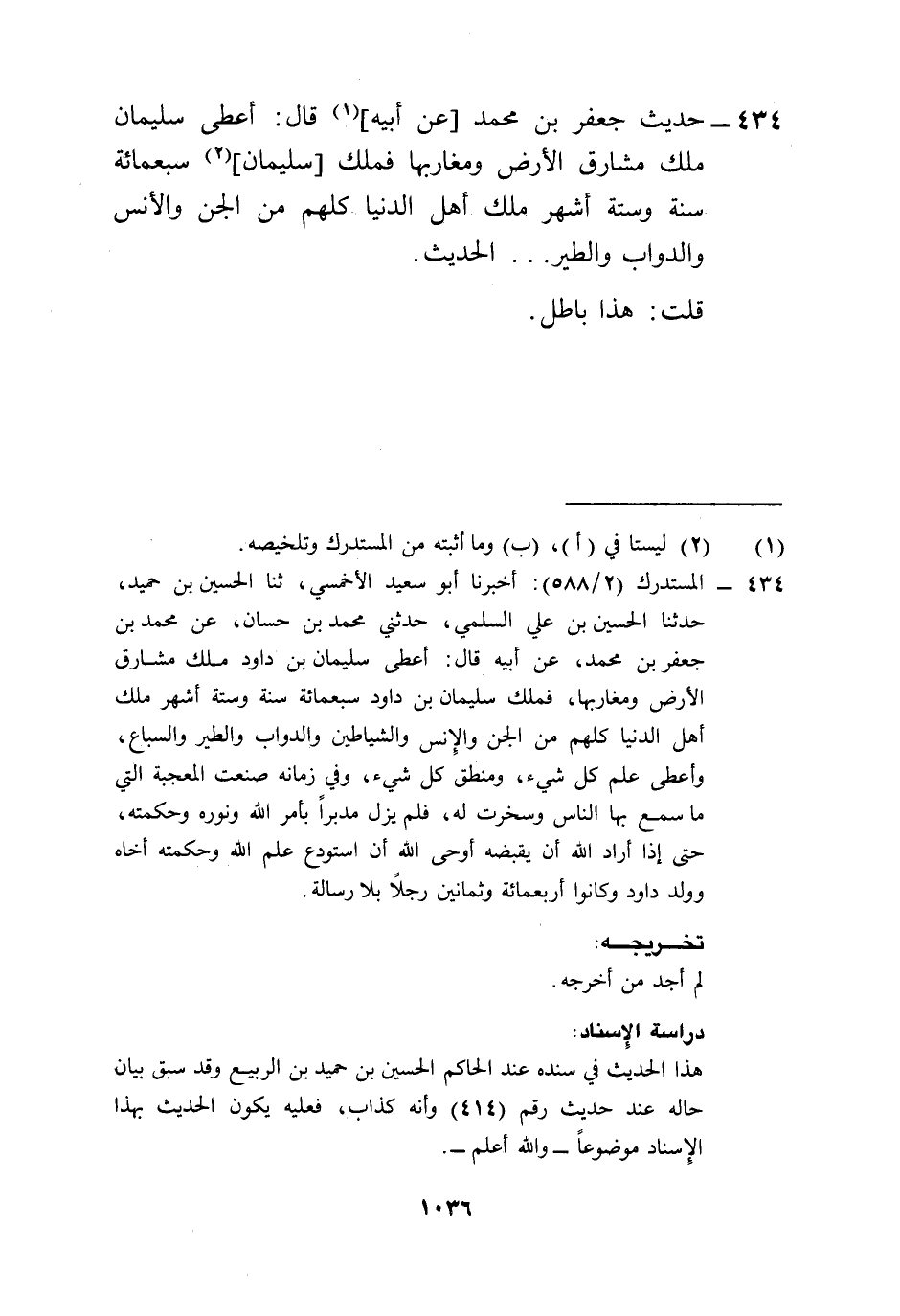 434 - المستدرك (2/ 588): أخبرنا أبو سعيد الأخمسي، ثنا الحسين بن حميد، حدثنا الحسين بن علي السلمي، حدثني محمد بن حسان، عن محمد بن جعفر بن محمد، عن أبيه قال: أعطى سليمان بن داود ملك مشارق الأرض ومغاربها، فملك سليمان بن داود سبعمائة سنة وستة أشهر ملك أهل الدنيا كلهم من الجن والِإنس والشياطن والدواب والطير والسباع، وأعطى علم كل شيء، ومنطق على شيء، وفي زمانه صنعت المعجبة التي ما سمع بها الناس وسخرت له، فلم يزل مدبراً بأمر الله ونوره وحكمته، حتى إذا أراد الله أن يقبضه أوحى الله أن استودع علم الله وحكمته أخاه وولد داود وكانوا أربعمائة وثمانين رجلاً بلا رسالة.