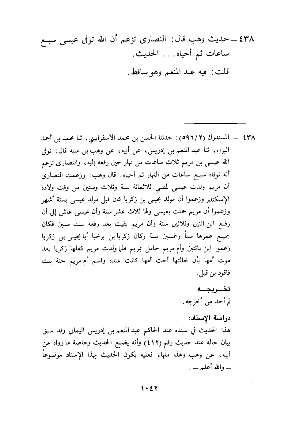 438 - المستدرك (2/ 596): حدثنا الحسن بن محمد الأسفراييني، ثنا محمد بن أحمد البراء، ثنا عبد المنعم بن إدريس، عن أبيه، عن وهب بن منبه قال: توفى الله عيسى بن مريم ثلاث ساعات من نهار حين رفعه إليه، والنصارى تزعم أنه توفاه سبع ساعات من النهار ثم أحياه. قال وهب: وزعمت النصارى أن مريم ولدت عيسى لمضي ثلاثمائة سنة وثلاث وستين من وقت ولادة الِإسكندر وزعموا أن مولد يحيى بن زكريا كان قبل مولد عيسى بستة أشهر وزعموا أن مريم حملت بعيسى ولها ثلاث عشر سنة وأن عيسى عاش إلى أن رفع ابن اثنين وثلاثين سنة وأن مريم بقيت بعد رفعه ست سنين فكان جميع عمرها ستاً وخمسين سنة وكان زكريا بن برخيا أبا يحيى بن زكريا زعموا ابن مائتين وأم مريم حامل بمريم فلما ولدت مريم كفلها زكريا بعد موت أمها بأن خالتها أخت أمها كانت عنده واسم أم مريم حنة بنت فاقوذ بن قيل.