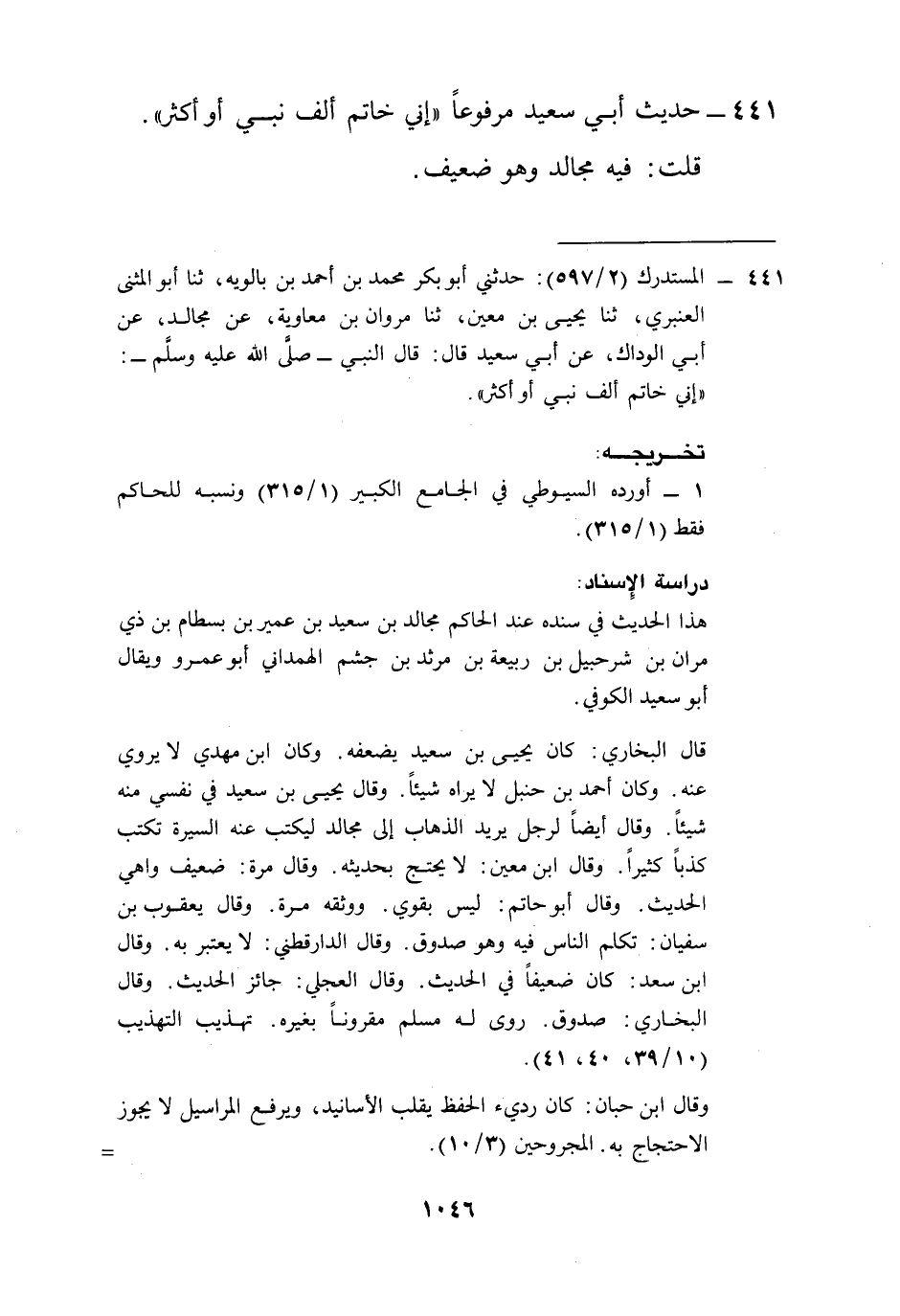 441 - المستدرك (2/ 597): حدثني أبو بكر محمد بن أحمد بن بالويه، ثنا أبو المثنى العنبري، ثنا يحيى بن معين، ثنا مروان بن معاوية، عن مجالد، عن أبي الوداك، عن أبي سعيد قال: قال النبي -صلى الله عليه وسلم-: "إني خاتم ألف نبي أو أكثر".