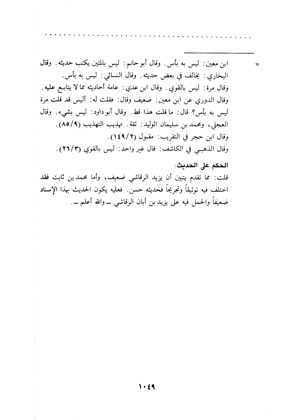 قلت: مما تقدم يتبين أن يزيد الرقاشي ضعيف، وأما محمد بن ثابت فقد اختلف فيه توثيقاً وتجريحاً فحديثه حسن. فعليه يكون الحديث بهذا الإِسناد ضعيفاً والحمل فيه على يزيد بن أبان الرقاشي -والله أعلم-.