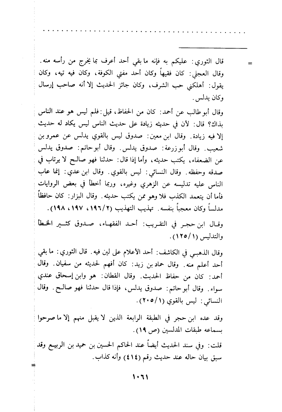 وقال الذهبي في الكاشف: أحد الأعلام على لين فيه. قال الثوري: ما بقي أحد أعلم منه. وقال حماد بن زيد: كان أفهم لحديثه من سفيان. وقال أحمد: كان من حفاظ الحديث. وقال القطان: هو وابن إسحاق عندي سواء. وقال أبو حاتم: صدوق يدلس، فإذا قال حدثنا فهو صالح. وقال النسائي: ليس بالقوي (1/ 205).