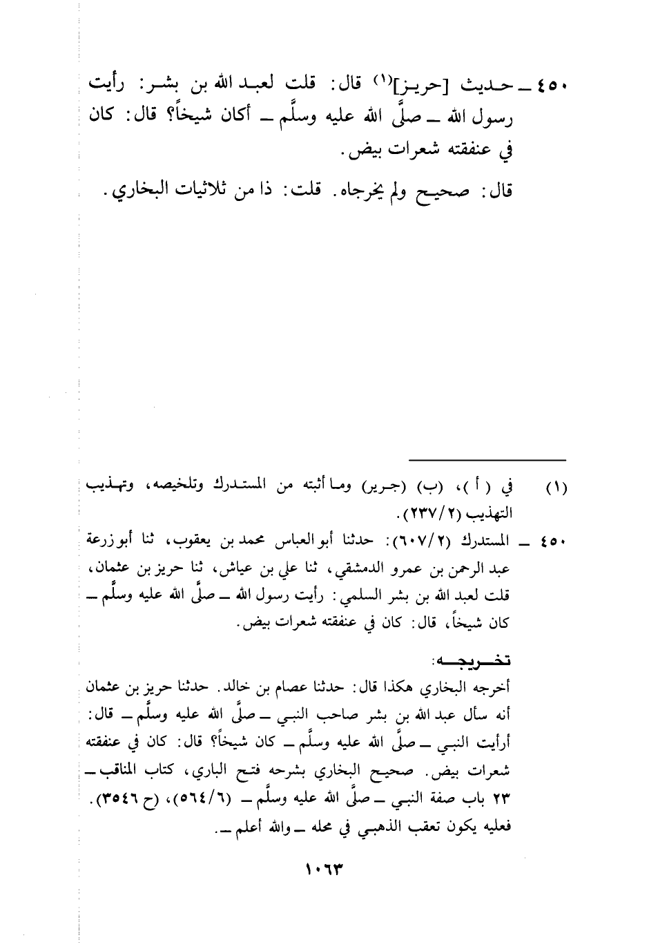 450 - المستدرك (2/ 607): حدثنا أبو العباس محمد بن يعقوب، ثنا أبو زرعة عبد الرحمن بن عمرو الدمشقي، ثنا علي بن عياش، ثنا حريز بن عثمان، قلت لعبد الله بن بشر السلمي: رأيت رسول الله -صلى الله عليه وسلم- كان شيخاً، قال: كان في عنفقته شعرات بيض.