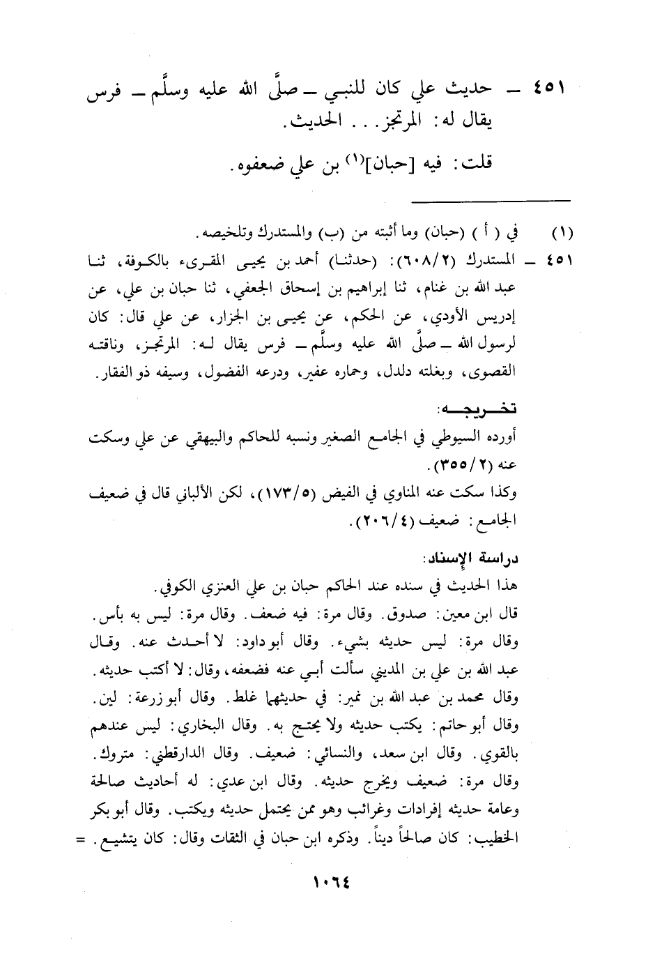 451 - المستدرك (2/ 608): (حدثنا) أحمد بن يحيى المقرىء بالكوفة، ثنا عبد الله بن غنام، ثنا إبراهيم بن إسحاق الجعفي، ثنا حبان بن علي، عن إدريس الأودي، عن الحكم، عن يحيى بن الجزار، عن علي قال: كان لرسول الله -صلى الله عليه وسلم- فرس يقال له: المرتجز، وناقته القصوى، وبغلته دلدل، وحماره عفير، ودرعه الفضول، وسيفه ذو الفقار.