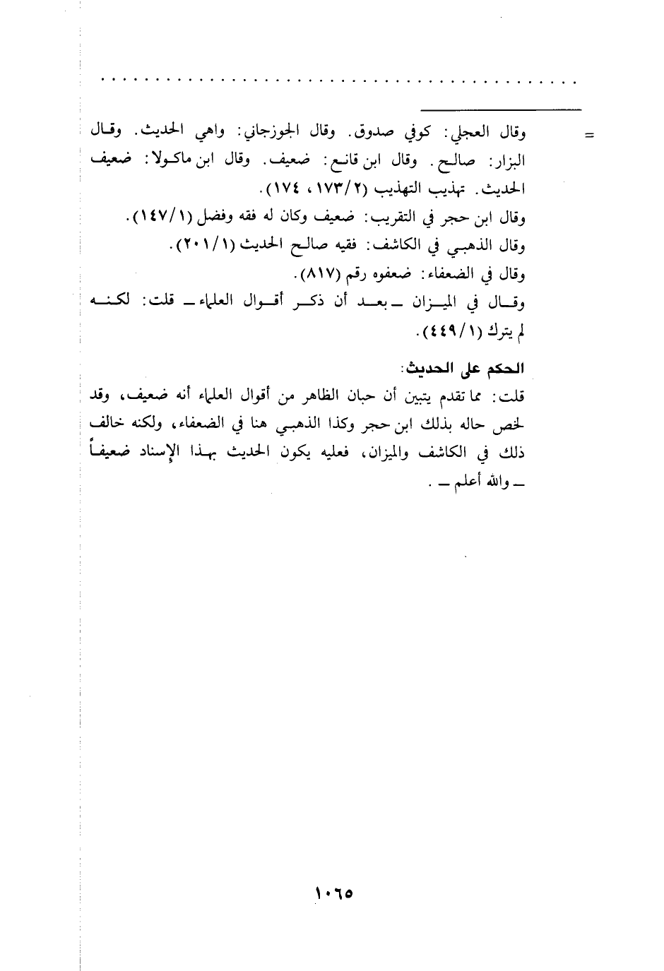 قلت: مما تقدم يتبين أن حبان الظاهر من أقوال العلماء أنه ضعيف، وقد لخص حاله بذلك ابن حجر وكذا الذهبي هنا في الضعفاء، ولكنه خالف ذلك في الكاشف والميزان، فعليه يكون الحديث بهذا الإسناد ضعيفاً -والله أعلم-.