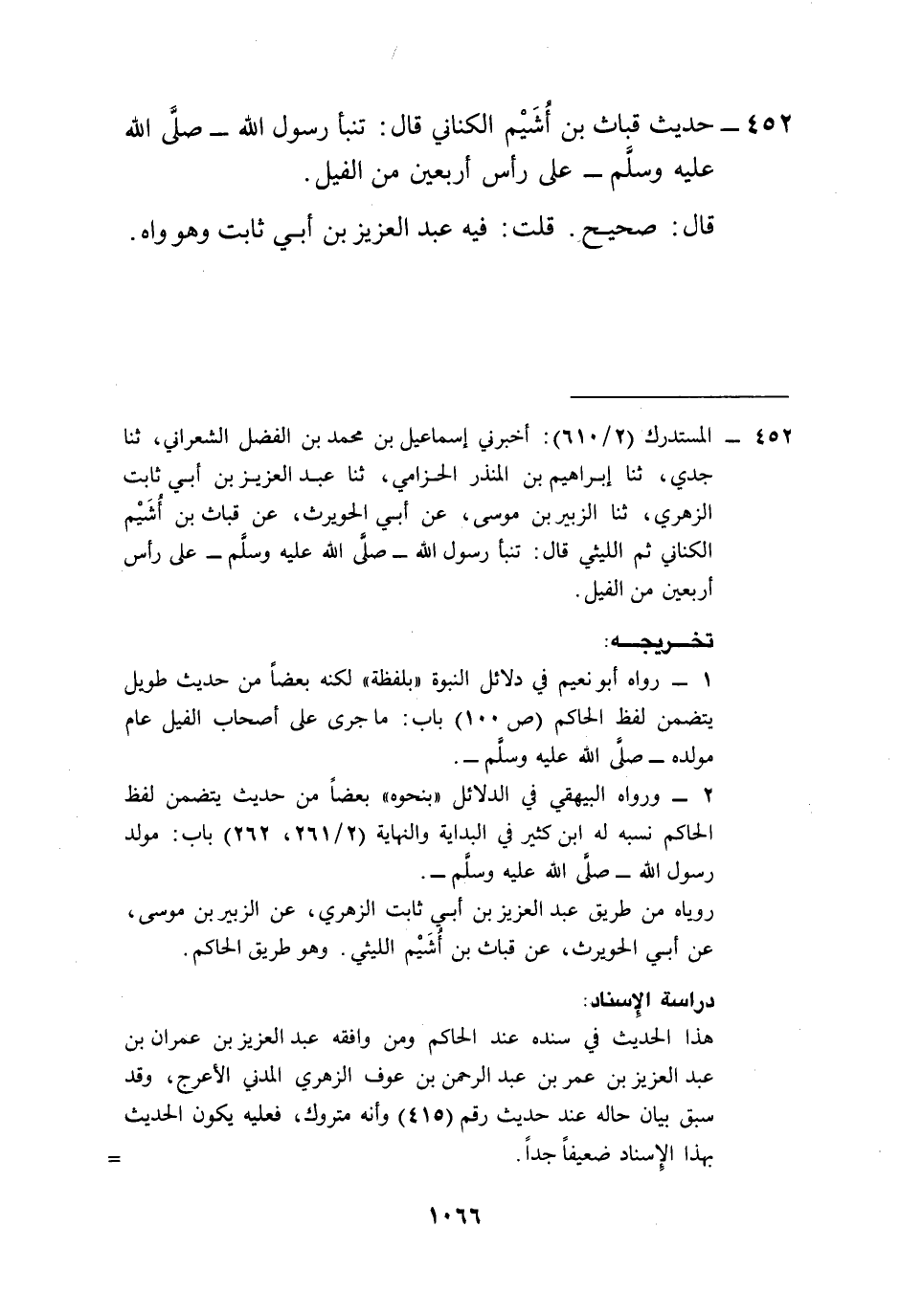 452 - المستدرك (2/ 610): أخبرني إسماعيل بن محمد بن الفضل الشعراني، ثنا جدي، ثنا إبراهيم بن المنذر الحزامي، ثنا عبد العزيز بن أبي ثابت الزهري، ثنا الزبير بن موسى، عن أبي الحويرث، عن قباث بن أُشَيْم الكناني ثم الليثي قال: تنبأ رسول الله -صلى الله عليه وسلم- على رأس أربعين من الفيل.