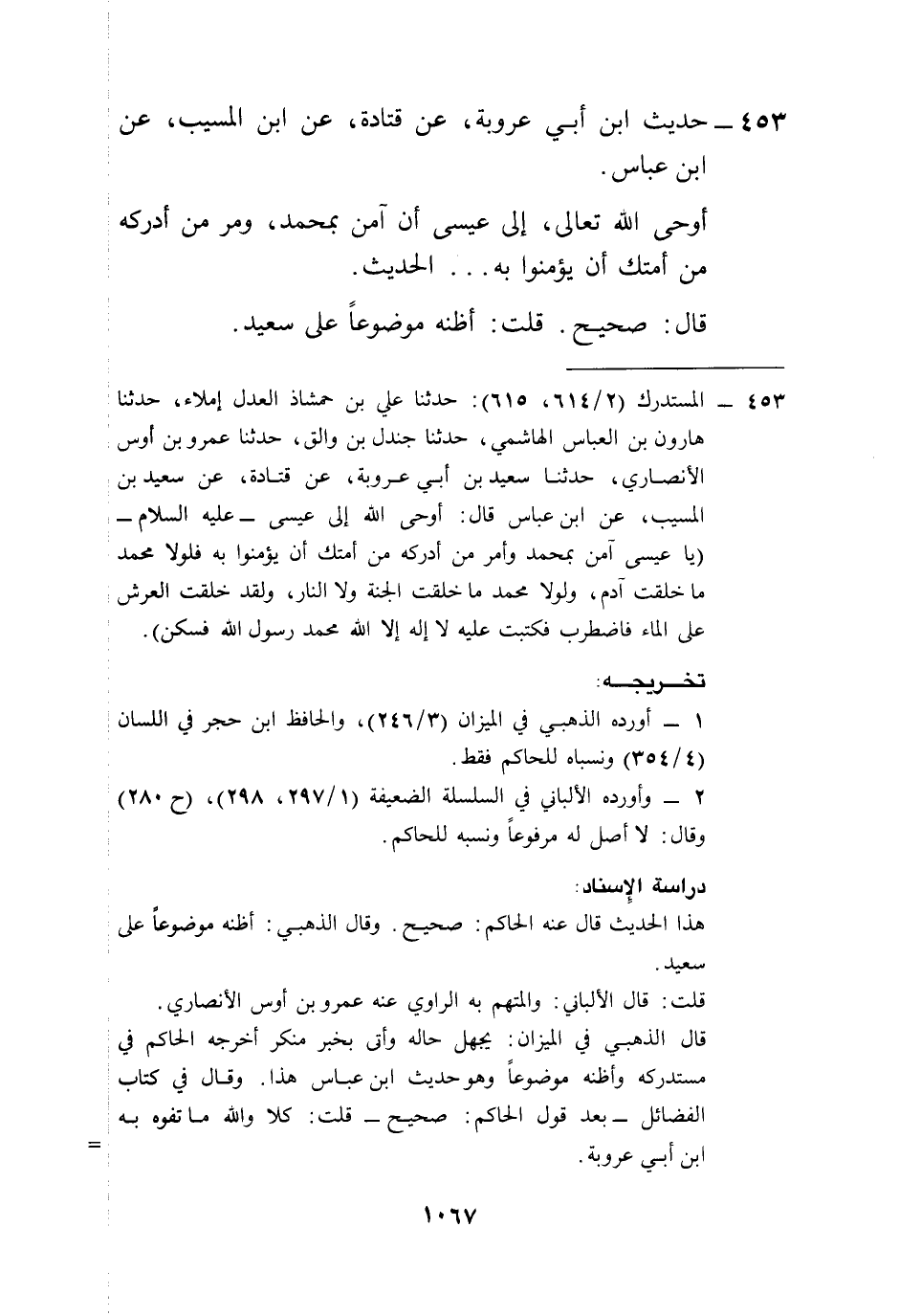 453 - المستدرك (2/ 614، 615): حدثنا علي بن حمشاذ العدل إملاء، حدثنا هارون بن العباس الهاشمي، حدثنا جندل بن والق، حدثنا عمرو بن أوس الأنصاري، حدثنا سعيد بن أبي عروبة، عن قتادة، عن سعيد بن المسيب، عن ابن عباس قال: أوحى الله إلى عيسى- عليه السلام- (يا عيسى آمن بمحمد وأمر من أدركه من أمتك أن يؤمنوا به فلولا محمد ما خلقت آدم، ولولا محمد ما خلقت الجنة ولا النار، ولقد خلقت العرش على الماء فاضطرب فكتبت عليه لا إله إلا الله محمد رسول الله فسكن).