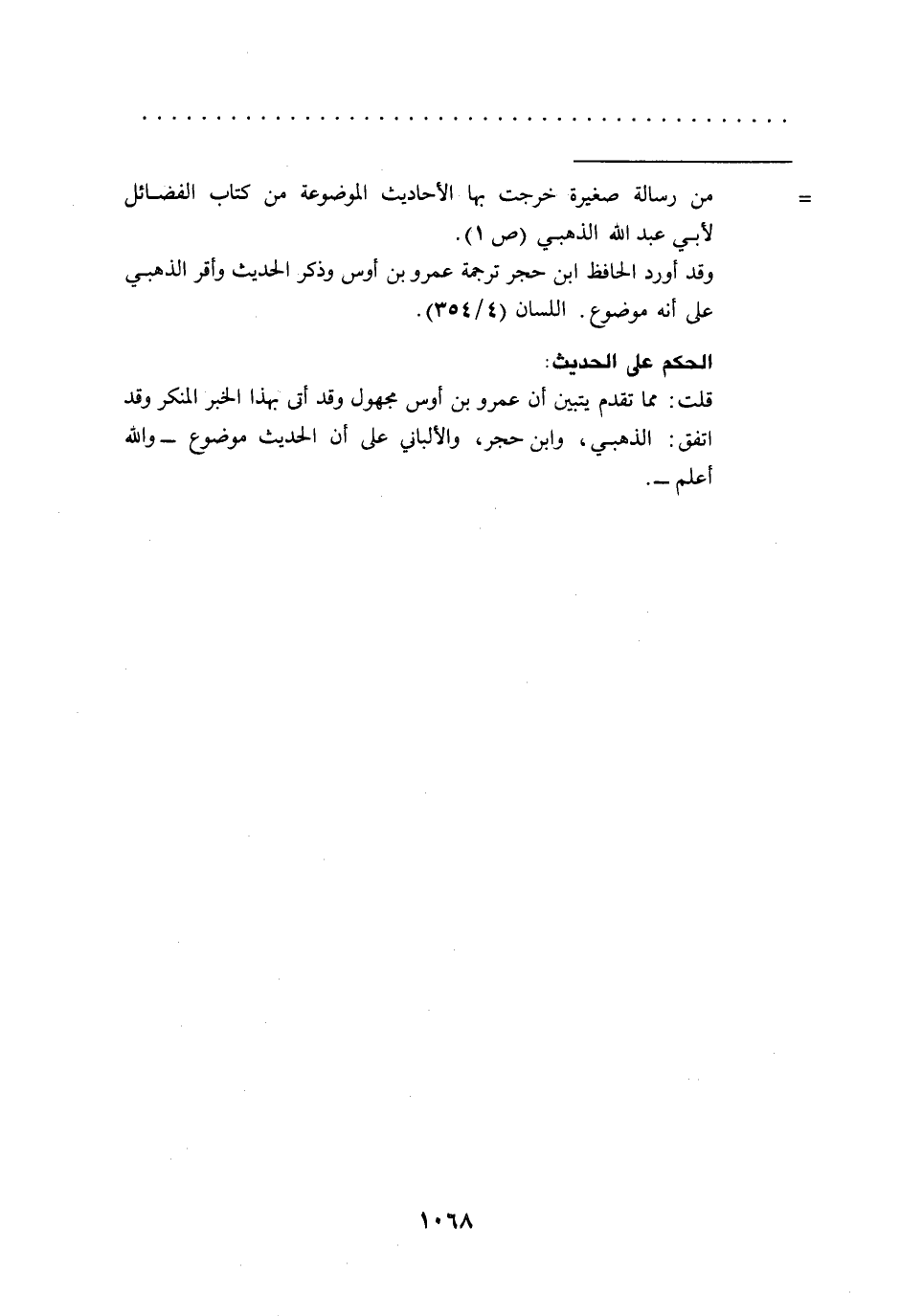 قلت: مما تقدم يتبين أن عمرو بن أوس مجهول وقد أتى بهذا الخبر المنكر وقد اتفق: الذهبي، وابن حجر، والألباني على أن الحديث موضوع -والله أعلم.