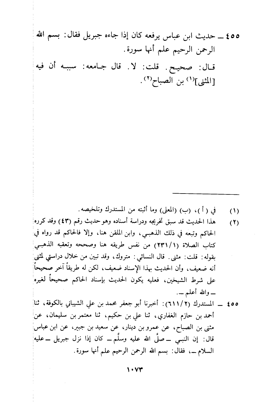 455 - المستدرك (2/ 611): أخبرنا أبو جعفر محمد بن علي الشيباني بالكوفة، ثنا أحمد بن حازم الغفاري، ثنا علي بن حكيم، ثنا معتمر بن سليمان، عن مثنى بن الصباح، عن عمرو بن دينار، عن سعيد بن جبير، عن ابن عباس قال: إن النبي -صلى الله عليه وسلم- كان إذا نزل جبريل -عليه السلام-، فقال: بسم الله الرحمن الرحيم علم أنها سورة.