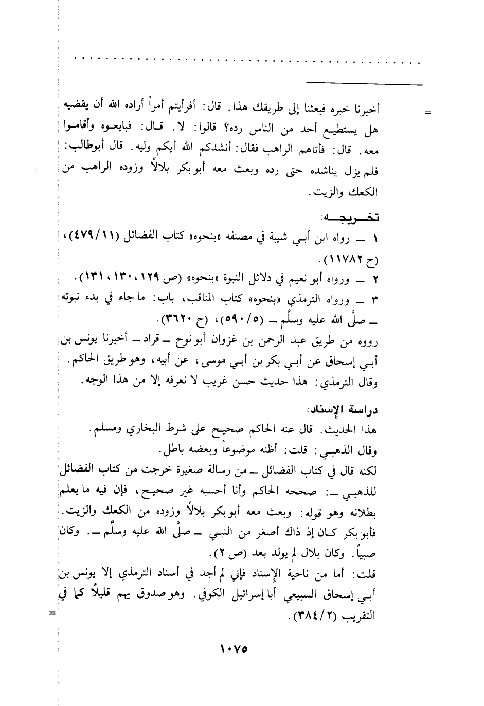 لكنه قال في كتاب الفضائل -من رسالة صغيرة خرجت من كتاب الفضائل للذهبي-: صححه الحاكم وأنا أحسبه غير صحيح، فإن فيه ما يعلم بطلانه وهو قوله: وبعث معه أبو بكر بلالًا وزوده من الكعك والزيت.