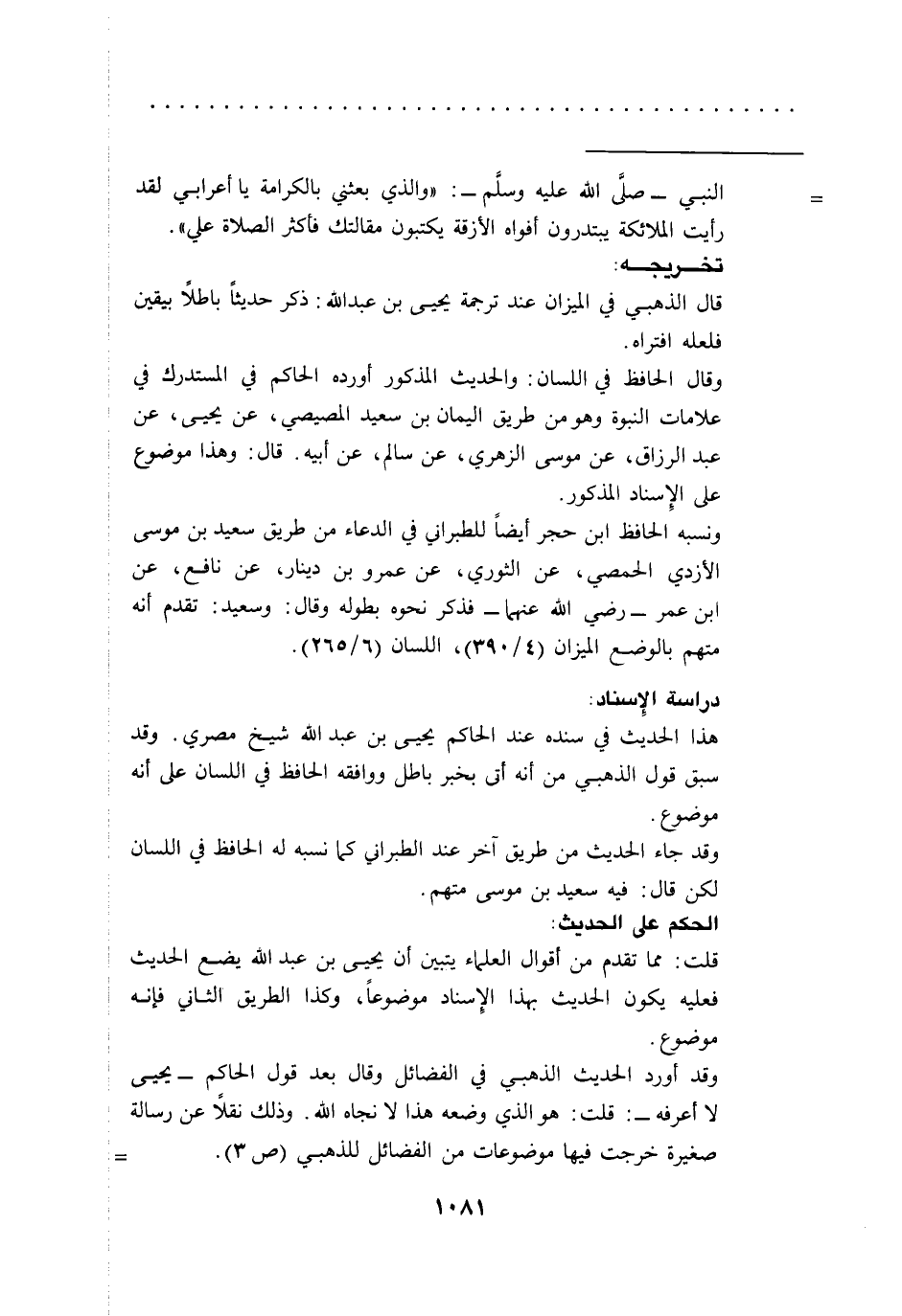 وقال الحافظ في اللسان: والحديث المذكور أورده الحاكم في المستدرك في علامات النبوة وهو من طريق اليمان بن سعيد المصيصي، عن يحيى، عن عبد الرزاق، عن موسى الزهري، عن سالم، عن أبيه. قال: وهذا موضوع على الإِسناد المذكور.