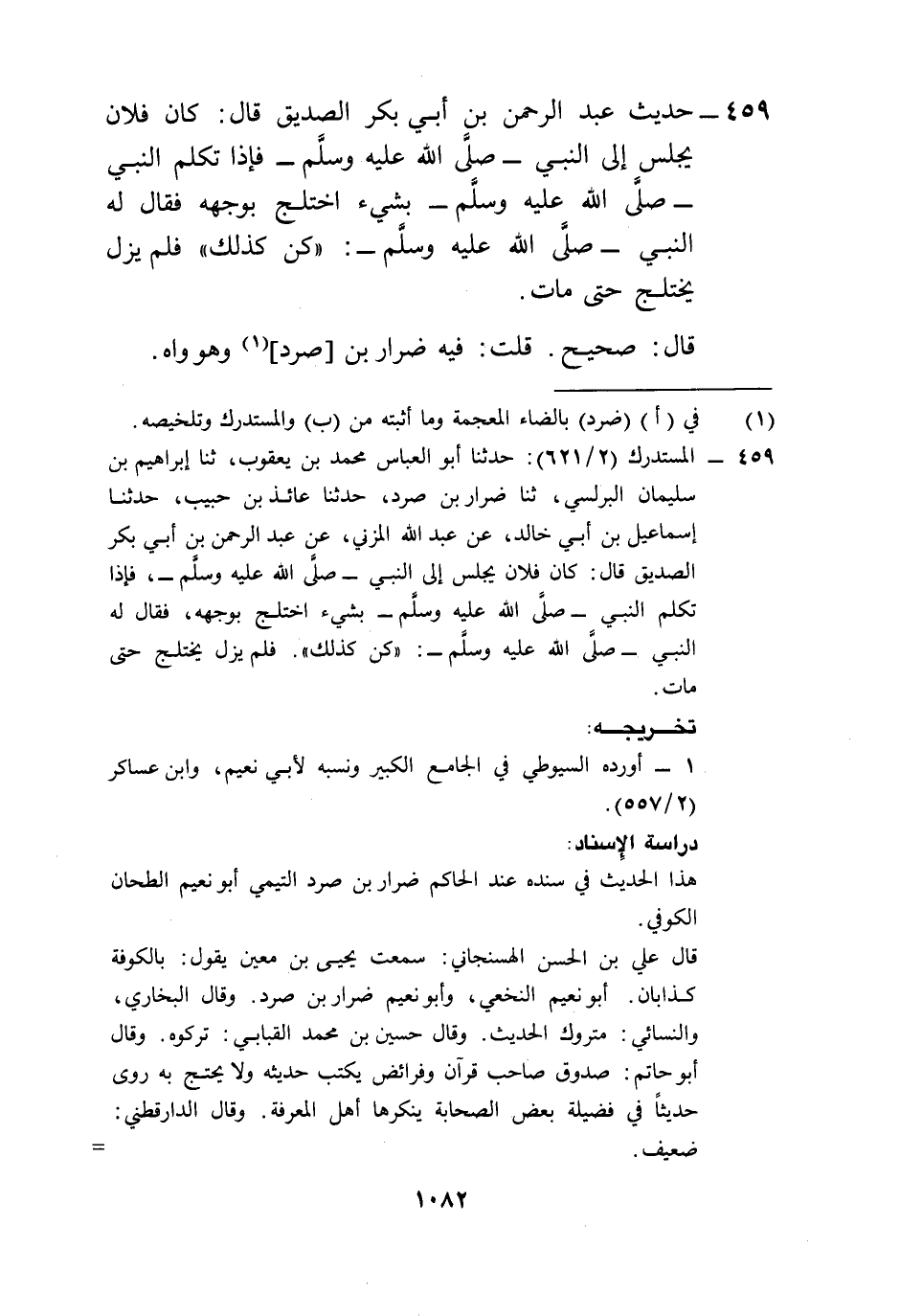 459 - المستدرك (2/ 621): حدثنا أبو العباس محمد بن يعقوب، ثنا إبراهيم بن سليمان البرلسي، ثنا ضرار بن صرد، حدثنا عائذ بن حبيب، حدثنا إسماعيل بن أبي خالد، عن عبد الله المزني، عن عبد الرحمن بن أبي بكر الصديق قال: كان فلان يجلس إلى النبي -صلى الله عليه وسلم-، فإذا تكلم النبي -صلى الله عليه وسلم- بشيء اختلج بوجهه، فقال له النبي -صلى الله عليه وسلم-: "كن كذلك". فلم يزل يختلج حتى مات.