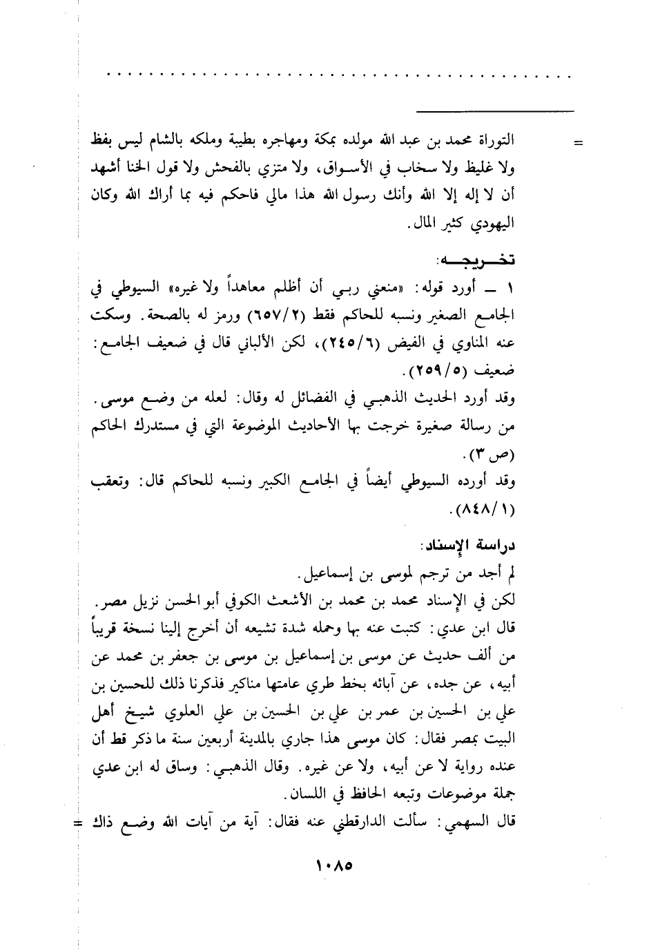 قال ابن عدي: كتبت عنه بها وحمله شدة تشيعه أن أخرج إلينا نسخة قريباً من ألف حديث عن موسى بن إسماعيل بن موسى بن جعفر بن محمد عن أبيه، عن جده، عن آبائه بخط طري عامتها مناكير فذكرنا ذلك للحسين بن علي بن الحسين بن عمر بن علي بن الحسين بن علي العلوي شيخ أهل البيت بمصر فقال: كان موسى هذا جاري بالمدينة أربعين سنة ما ذكر قط أن عنده رواية لا عن أبيه، ولا عن غيره. وقال الذهبي: وساق له ابن عدي جملة موضوعات وتبعه الحافظ في اللسان.