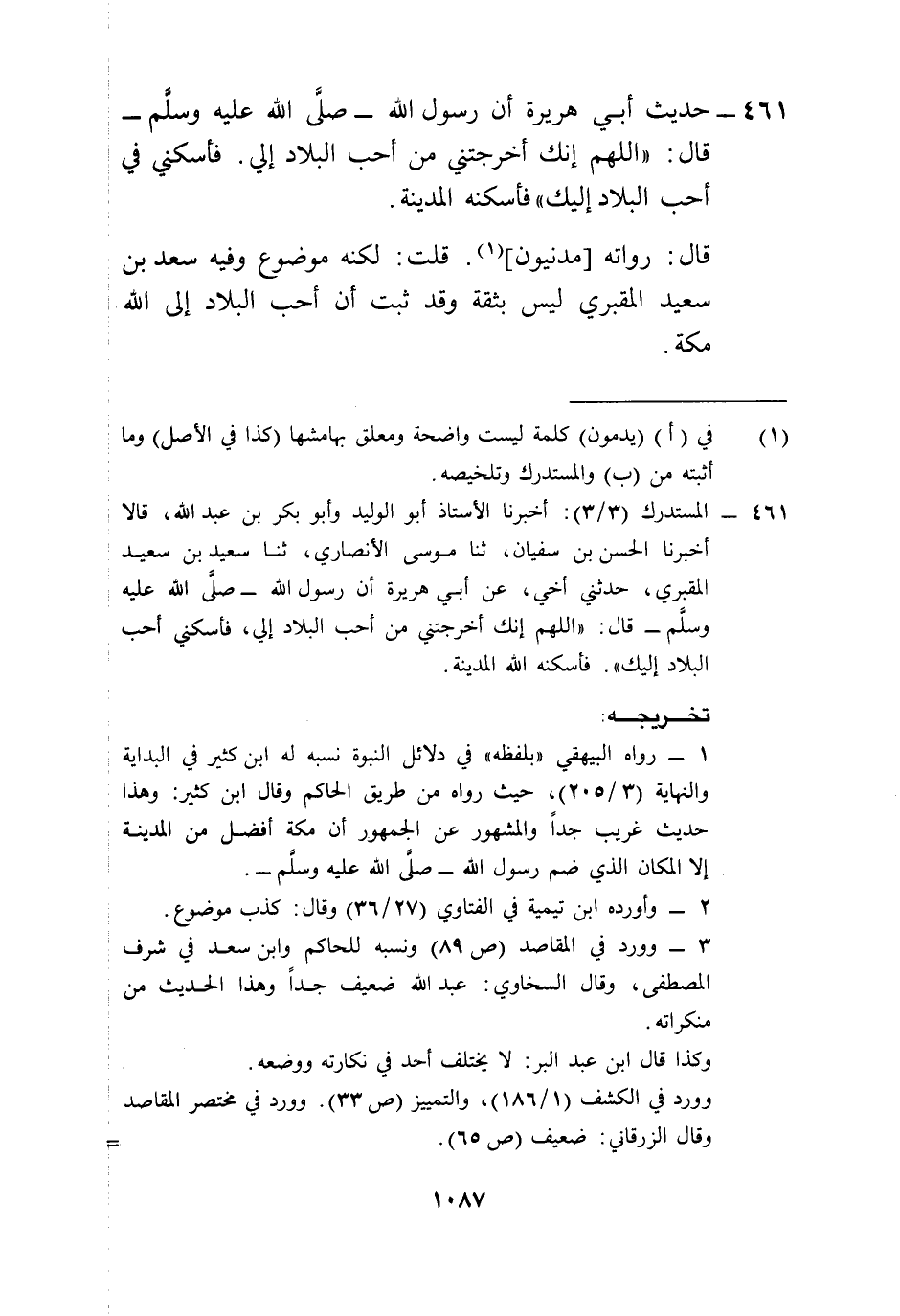 461 - المستدرك (3/ 3): أخبرنا الأستاذ أبو الوليد وأبو بكر بن عبد الله، قالا أخبرنا الحسن بن سفيان، ثنا موسى الأنصاري، ثنا سعيد بن سعيد المقبري، حدثني أخي، عن أبي هريرة أن رسول الله -صلى الله عليه وسلم- قال: "اللهم إنك أخرجتني من أحب البلاد إلي، فأسكني أحب البلاد إليك". فأسكنه الله المدينة.