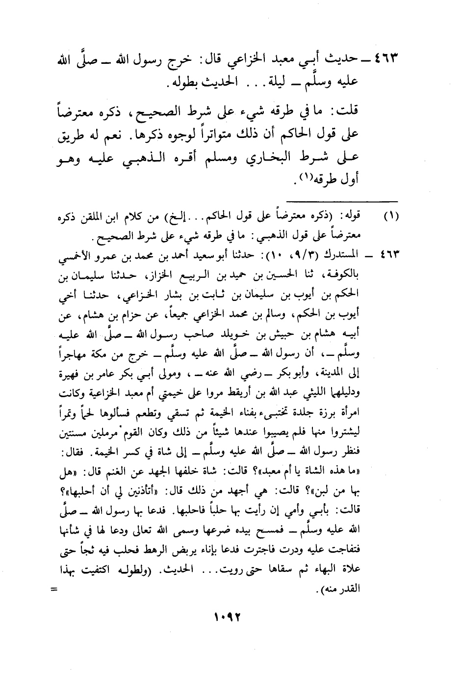 463 - المستدرك (3/ 9، 10): حدثنا أبو سعيد أحمد بن محمد بن عمرو الأخمسي بالكوفة، ثنا الحسين بن حميد بن الربيع الخزاز، حدثنا سليمان بن الحكم بن أيوب بن سليمان بن ثابت بن بشار الخزاعي، حدثنا أخي أيوب بن الحكم، وسالم بن محمد الخزاعي جميعاً، عن حزام بن هشام، عن أبيه هشام بن حبيش بن خويلد صاحب رسول الله -صلى الله عليه وسلم-، أن رسول الله -صلى الله عليه وسلم- خرج من مكة مهاجراً إلى المدينة، وأبو بكر -رضي الله عنه-، ومولى أبي بكر عامر بن فهيرة ودليلهما الليثي عبد الله بن أريقط مروا على خيمتي أم معبد الخزاعية وكانت امرأة برزة جلدة تختبيء بفناء الخيمة ثم تسقي وتطعم فسألوها لحماً وتمراً ليشتروا منها فلم يصيبوا عندها شيئاً من ذلك وكان القوم مرملين مسنتين فنظر رسول الله -صلى الله عليه وسلم- إلى شاة في كسر الخيمة. فقال: "ما هذه الشاة يا أم معبد"؟ قالت: شاة خلفها الجهد عن الغنم قال: "هل بها من لبن"؟ قالت: هي أجهد من ذلك قال: "أتأذنين لي أن أحلبها"؟ قالت: بأبي وأمي إن رأيت بها حلباً فاحلبها. فدعا بها رسول الله -صلى الله عليه وسلم- فمسح بيده ضرعها وسمى الله تعالى ودعا لها في شأنها فتفاجت عليه ودرت فاجترت فدعا بإناء يربض الرهط فحلب فيه ثجاً حتى علاة البهاء ثم سقاها حتى رويت ... الحديث. (ولطوله اكتفيت بهذا القدر منه). =