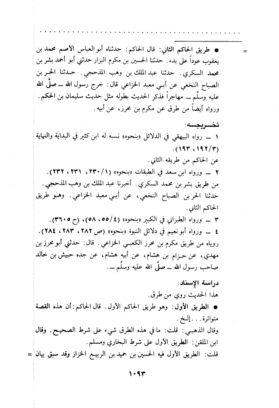 = * طريق الحاكم الثاني: قال الحاكم: حدثناه أبو العباس الأصم محمد بن يعقوب عوداً على بدء. حدثنا الحسين بن مكرم البزار حدثني أبو أحمد بشر بن محمد السكري. حدثنا عبد الملك بن وهب المذحجي. حدثنا الحر بن الصباح النخعي عن أبي معبد الخزاعي قال: خرج رسول الله -صلى الله عليه وسلم- مهاجراً فذكر الحديث بطوله مثل حديث سليمان بن الحكم.