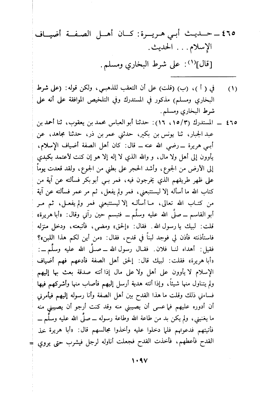 465 - المستدرك (3/ 15، 16): حدثنا أبو العباس محمد بن يعقوب، ثنا أحمد بن عبد الجبار، ثنا يونس بن بكير، حدثني عمر بن ذر، حدثنا مجاهد، عن أبي هريرة -رضي الله عنه- قال: كان أهل الصفة أضياف الإسلام، يأوون إلى أهل ولا مال، ووالله الذي لا إله إلا هو إن كنت لأعتمد بكبدي إلى الأرض من الجوع، وأشد الحجر على بطني من الجوع، ولقد قعدت يوماً على ظهر طريقهم الذي يخرجون فيه، فمر بي أبو بكر فسألته عن آية من كتاب الله ما أسأله إلا ليستتبعني، فمر ولم يفعل، ثم مر عمر فسألته عن آية من كتاب الله تعالى، ما أسأله إلا ليستتبعني فمر ولم يفعل، ثم مر أبو القاسم -صلَّى الله عليه وسلم- فتبسم حين رآني وقال: "أبا هريرة" قلت: لبيك يا رسول الله. فقال: "إلحق" ومضى، فأتبعته، ودخل منزله فاستأذنته فأذن لي فوجد لبناً في قدح، فقال: "من أين لكم هذا اللبن"؟ فقيل: أهداه لنا فلان. فقال رسول الله -صلى الله عليه وسلم-: "أبا هريرة" فقلت: لبيك قال: إلحق أهل الصفة فأدعهم فهم أضياف الِإسلام لا يأوون على أهل ولا على مال إذا أتته صدقة بعث بها إليهم ولم يتناول منها شيئاً، وإذا أتته هدية أرسل إليهم فأصاب منها وأشركهم فيها فساءني ذلك وقلت ما هذا القدح بين أهل الصفة وأنا رسوله إليهم فيأمرني أن أدوره عليهم فما عسى أن يصيبني منه وقد كنت أرجو أن يصيبني منه ما يغنيني، ولم يكن بد من طاعة الله وطاعة رسوله -صلى الله عليه وسلم- فأتيتهم فدعوتهم فلما دخلوا عليه وأخذوا مجالسهم قال: "أبا هريرة خذ القدح فأعطهم، فأخذت القدح فجعلت أناوله لرجل فيشرب حتى يروي =