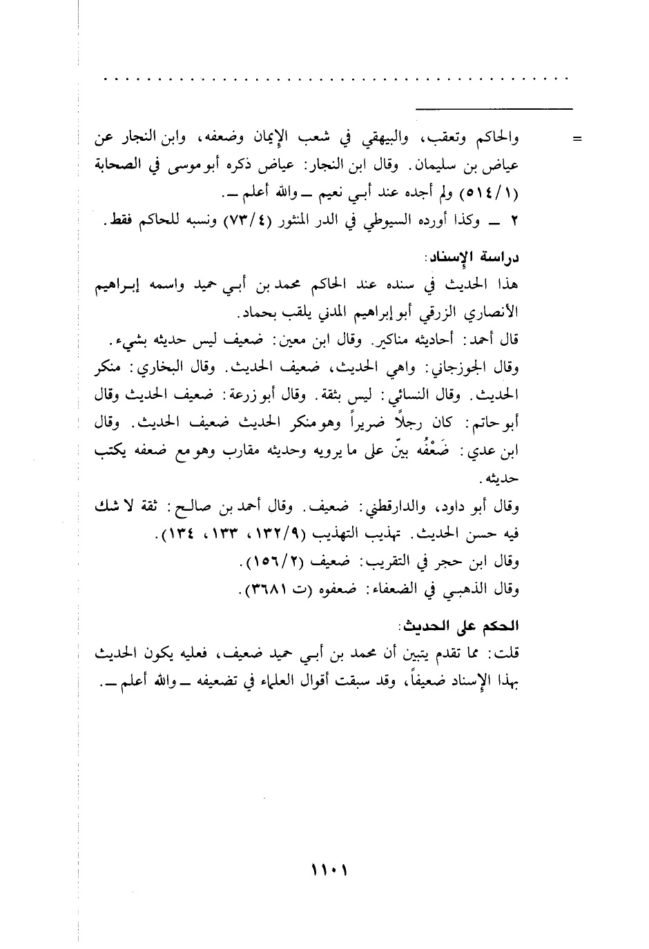 قلت: مما تقدم يتبين أن محمد بن أبي حميد ضعيف، فعليه يكون الحديث بهذا الِإسناد ضعيفاً، وقد سبقت أقوال العلماء في تضعيفه -والله أعلم-.