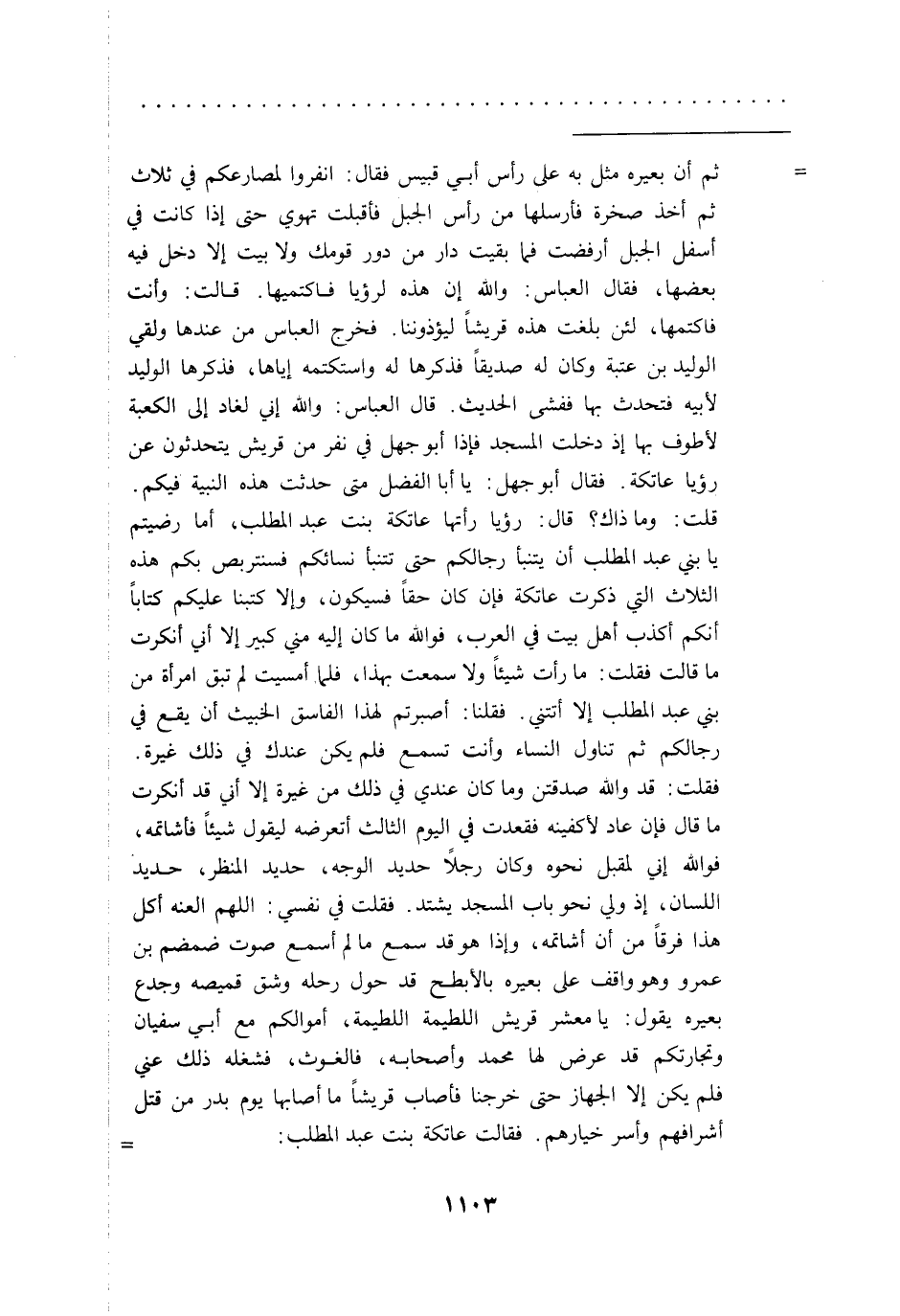 قلت: وما ذاك؟ قال. رؤيا رأتها عاتكة بنت عبد المطلب، أما رضيتم يا بني عبد المطلب أن يتنبأ رجالكم حتى تتنبأ نسائكم فسنتربص بكم هذه الثلاث التي ذكرت عاتكة فإن كان حقاً فسيكون، وإلا كتبنا عليكم كتاباً أنكم أكذب أهل بيت في العرب، فوالله ما كان إليه مني كبير إلا أني أنكرت ما قالت فقلت: ما رأت شيئاً ولا سمعت بهذا، فلما أمسيت لم تبق امرأة من بني عبد المطلب إلا أتتني. فقلنا: أصبرتم لهذا الفاسق الخبيث أن يقع في رجالكم ثم تناول النساء وأنت تسمع فلم يكن عندك في ذلك غيرة.